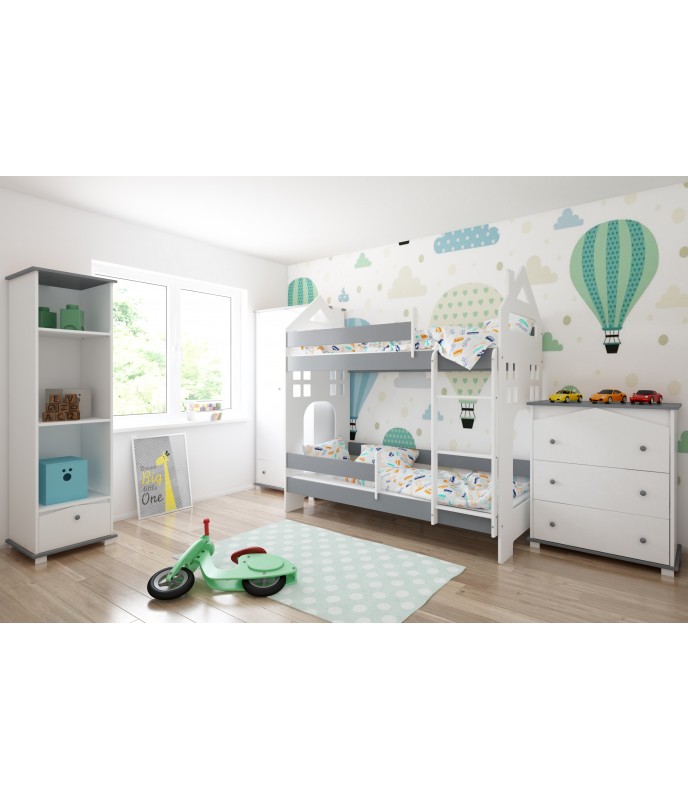 Detská poschodová posteľ v tvare domčeka spĺňa estetickú aj praktickú funkciu zariadenia detskej izby.