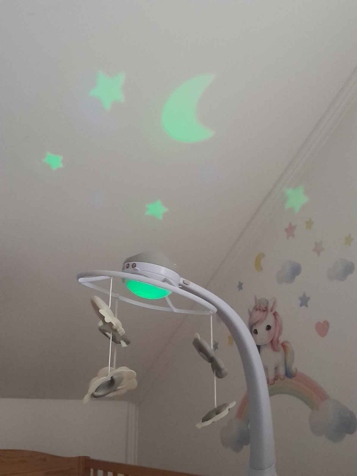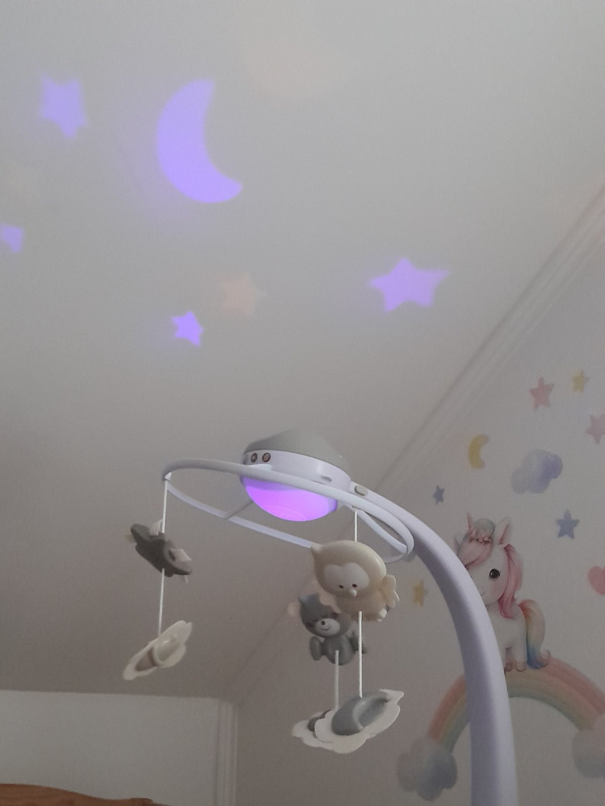 Veľmi málo používaný,nálepka je ešte na zrkadielku Obsahuje veľmi veľa melódií (šum mora, uspávanky - 10 melódií) Dá sa použiť aj ako nočná lampička na stôl. Má veľmi jednoduché pripevnenenie o postielku, a je pevný. Idú do ňho 3 AAA batérie.