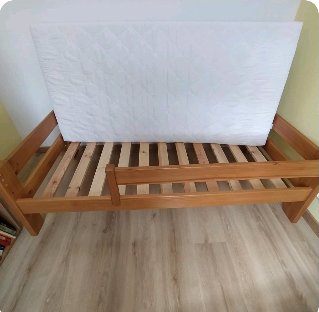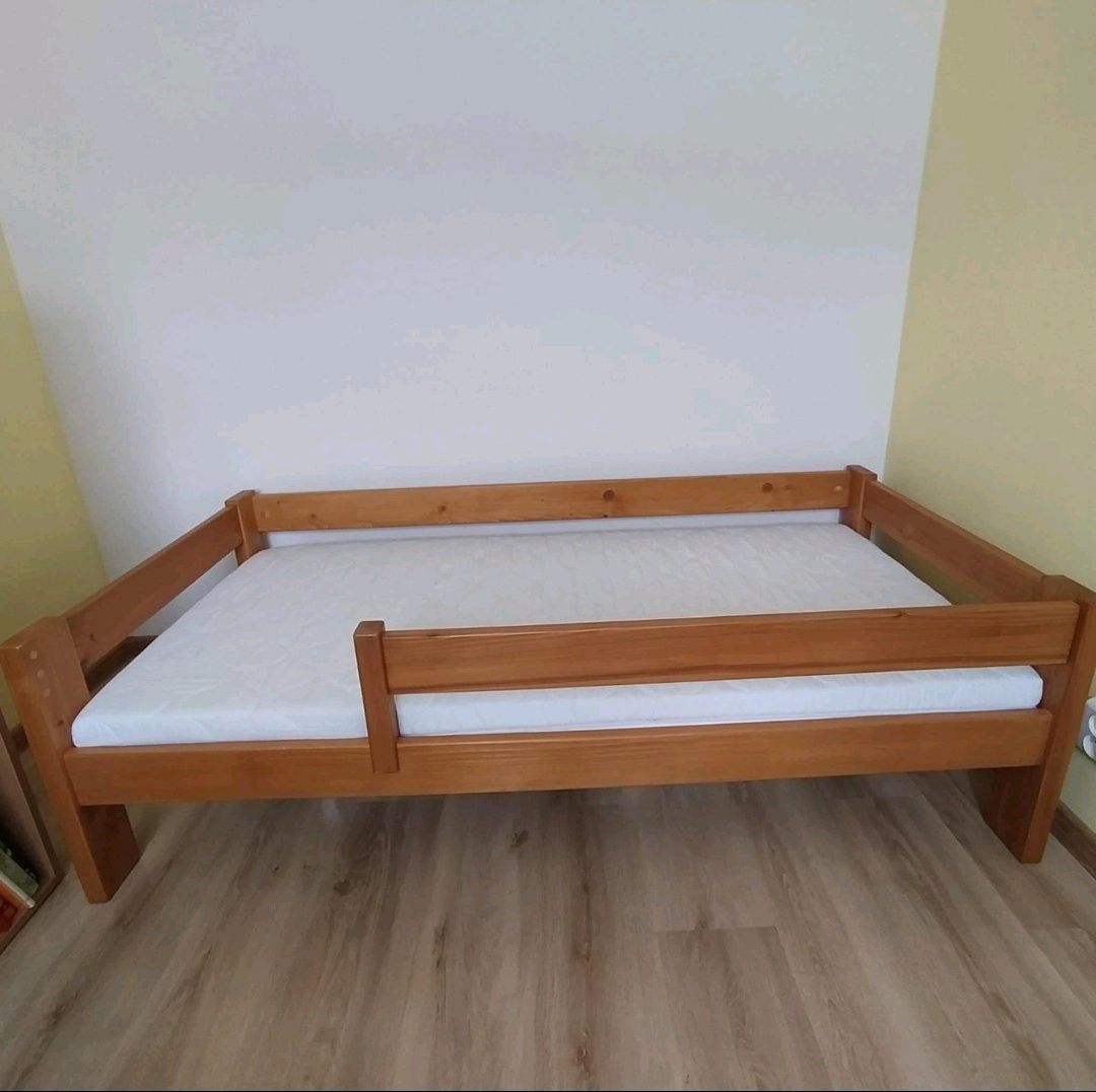Predám drevenú posteľ /masív/ s matracom vo veľmi dobrom,zachovalom stave. Zábrana sa dá aj odobrať aj podľa potreby preložiť na druhú stranu. Matrac má odnímateľný poťah, ktorý je už vyprany a pripravený na ďalšie použitie. Máme na predaj aj police,skrinky na hračky.