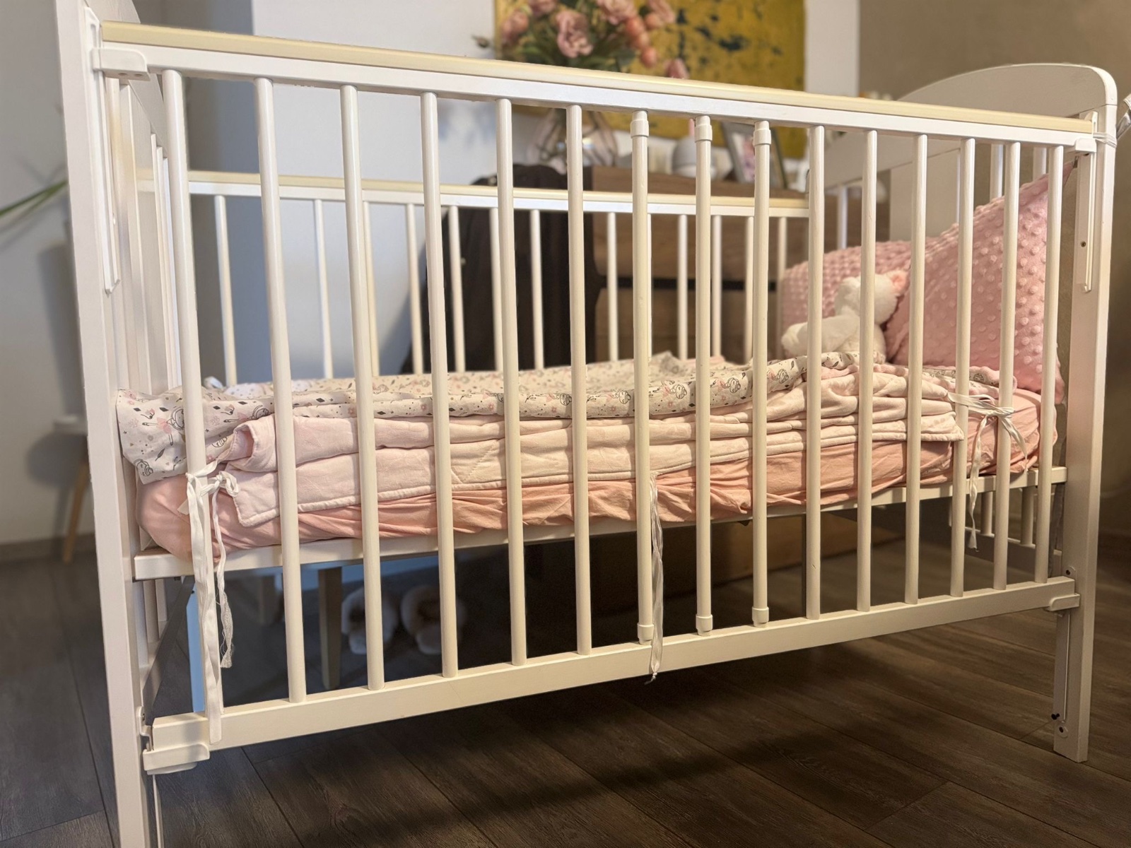 Drevená detská postieľka TOMI má z obidvoch strán veselý obrázok zajačika, ktorý dodáva nábytku očarujúci detský charakter. 3 výškové pozície regulácie dna postieľky uľahčujú vyberanie dieťatka a 3 vyberacie priečky zjednodušia neskôr starším deťom vychádzanie z postieľky.