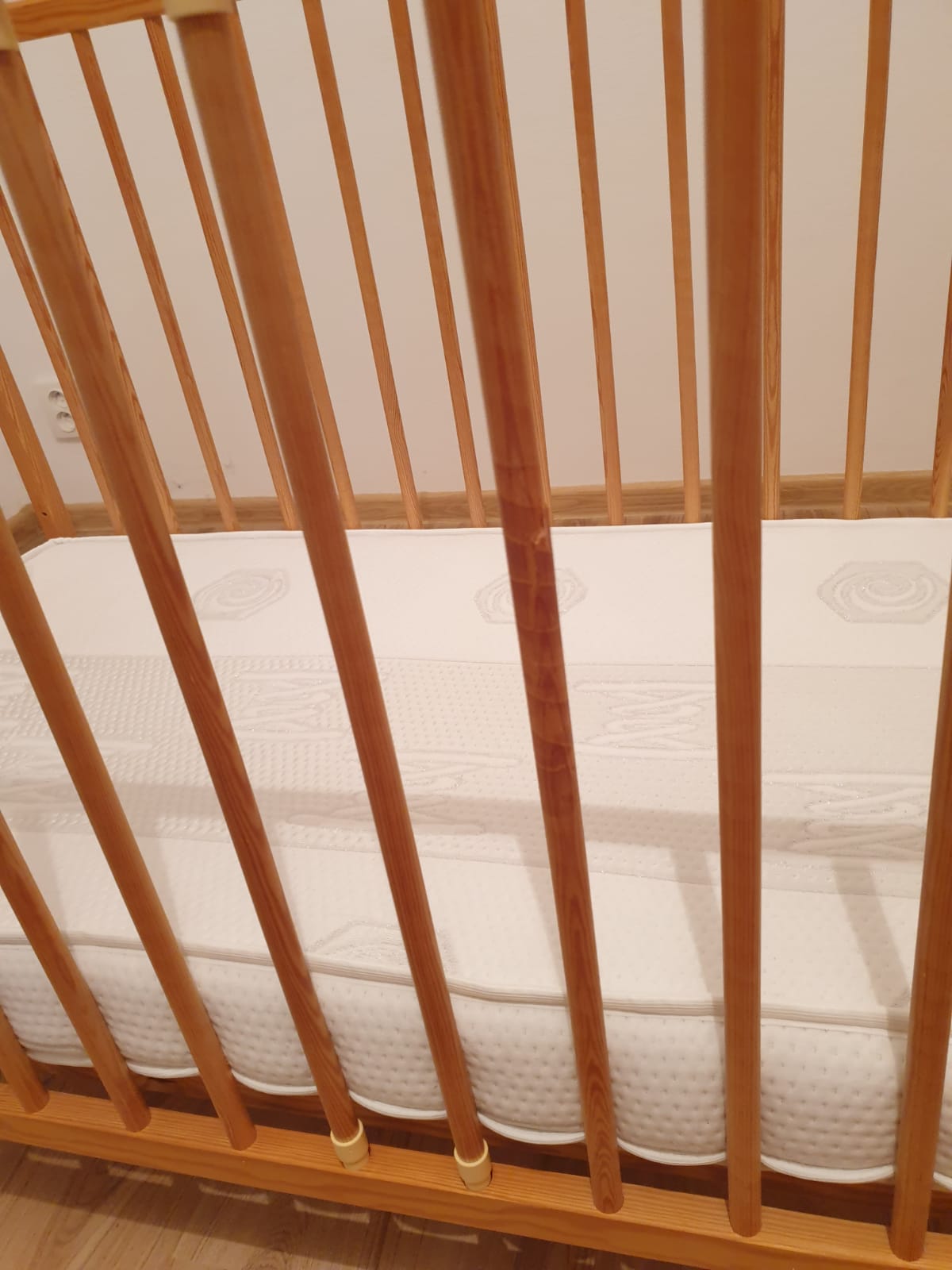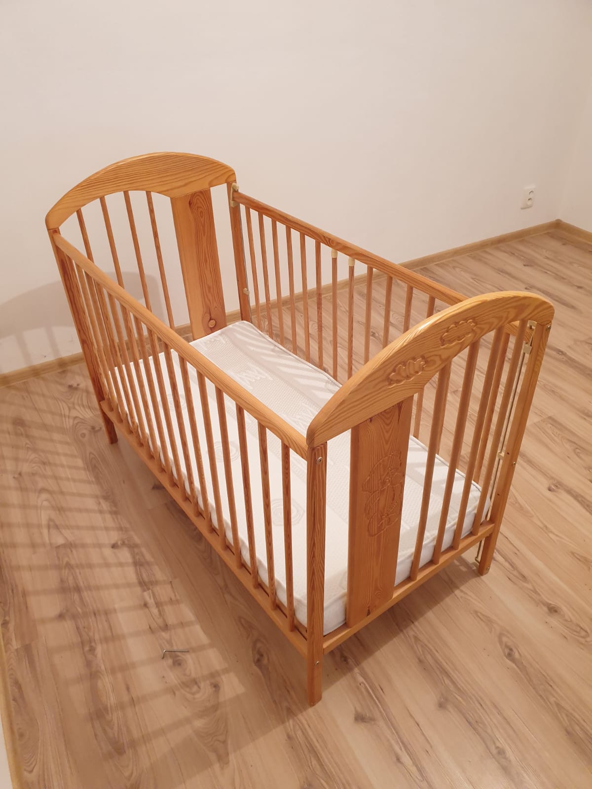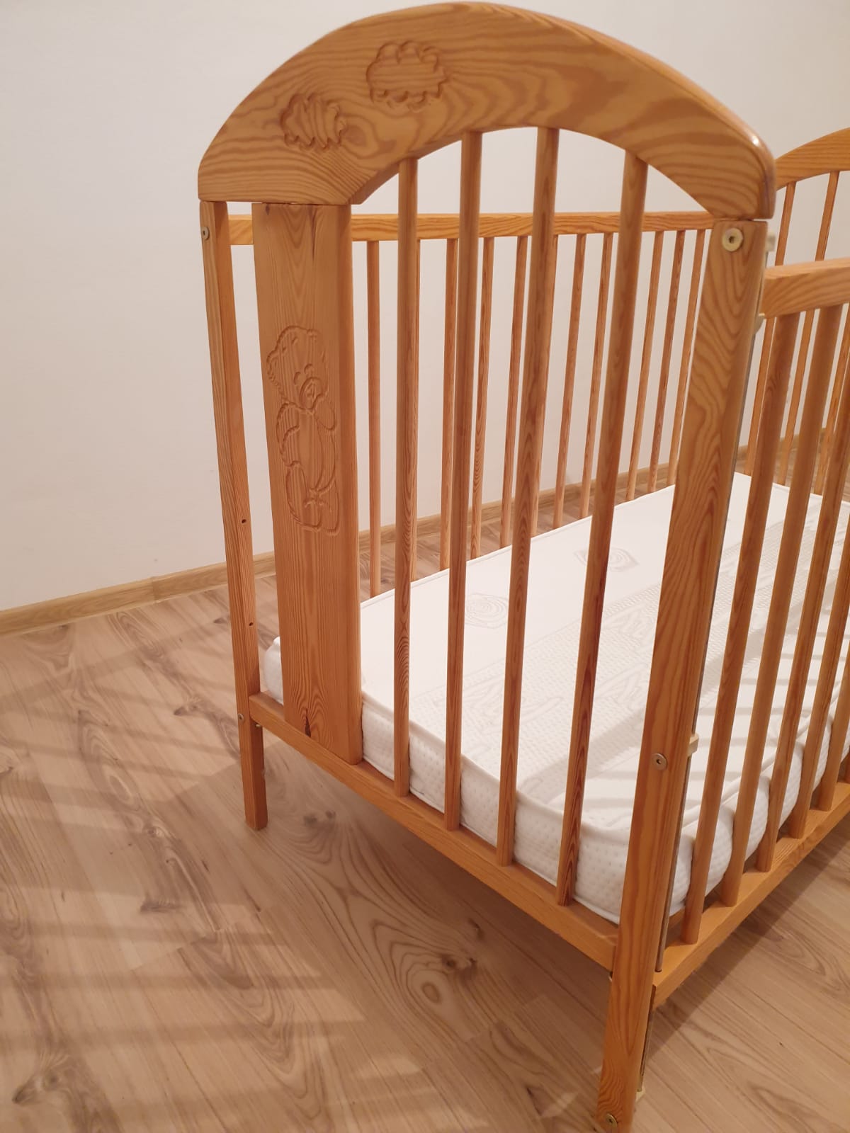 Predam peknu posielku spolu s matracom vo velmi dobrom stave. Poskodena iba jedna tycka, vid foto. Postielka je nastavitelka do 3 poloch, vyberatelne 2 tycky, posuvacia bocnica. Matrac s kokosovym stredom, s potahom na zips (potah je oprany). Osobny odber BA resp. DS