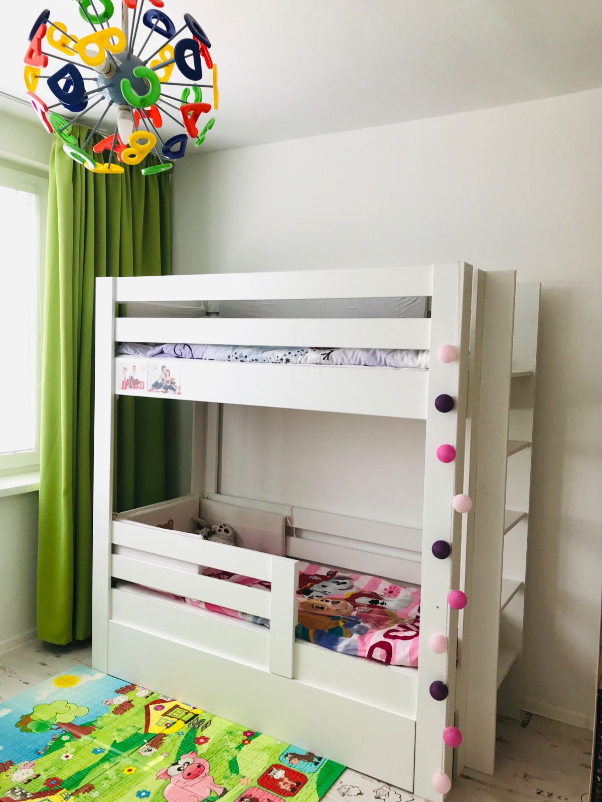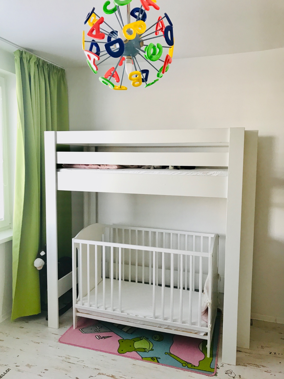 Posteľ bola používaná najprv v kombinácii s detskou postieľkou - tú už nemám 😉 - neskôr ako poschodová posteľ s úložným priestorom.