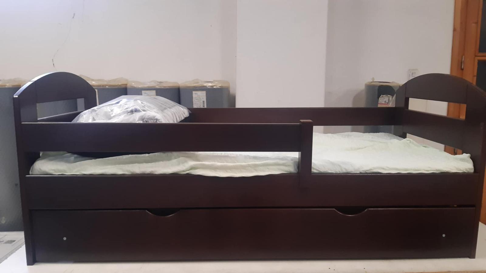 Veľmi málo používaná drevená posteľ so zábranou a úložným priestorom 170 x75 .Pridám k tomu aj matrac, vankúš, paplón, plachtu a obliečky. Všetko ako nové, bez chýb a poškodení..