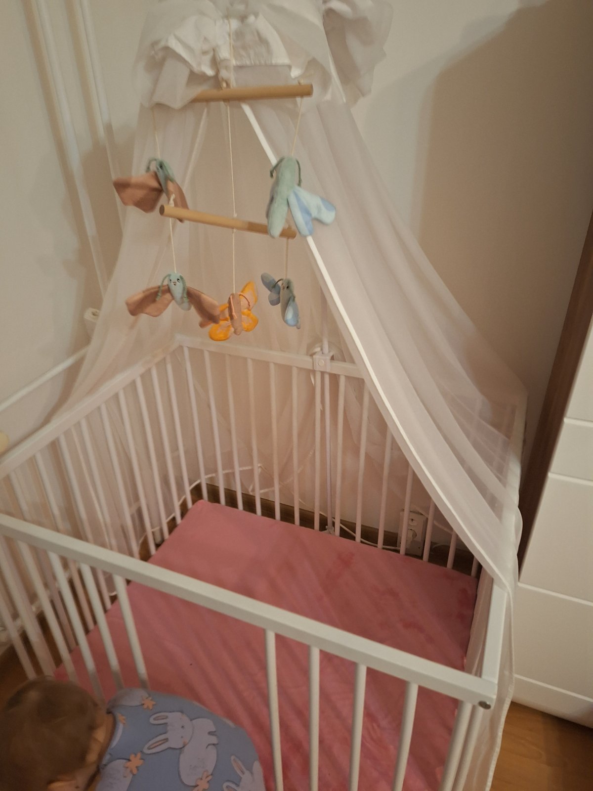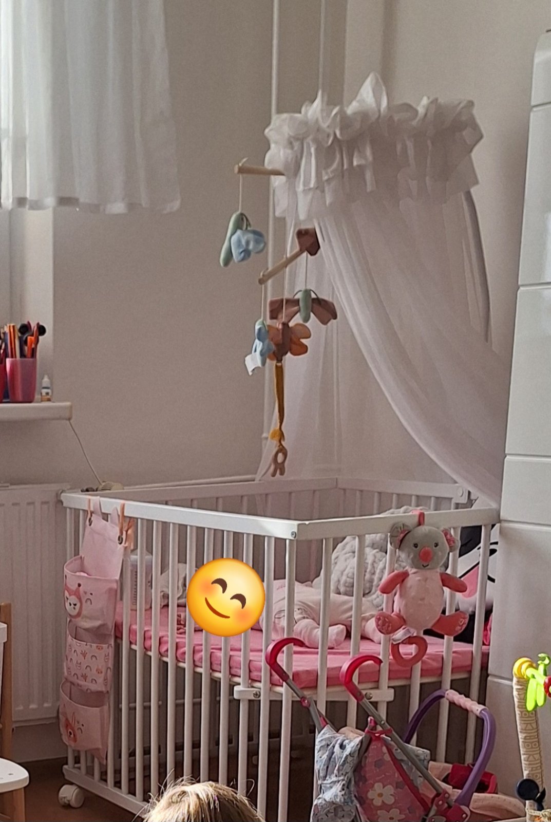 Predám polohovateľnú ohrádku/postieľku na kolečkách. Drevená ohrádka je vyrobená z kvalitného bukového dreva. Dno je vyrobené z MDF dosky obloženej molitanom a potiahnuté PVC na jednoduchšiu údržbu povrchu. Ohrádka má predvŕtané otvory na kolieska, ktoré sú súčasťou. Dno ohrádky je možné ľubovoľne výškovo polohovať. Mechanizmus polohovania horného lôžka je súčasťou ohrádky. K ohrádke máme aj matrac - 5 cm molitan. Ružová obliečka na matrac je na zips čiže ju môžete kedykoľvek vyprať.