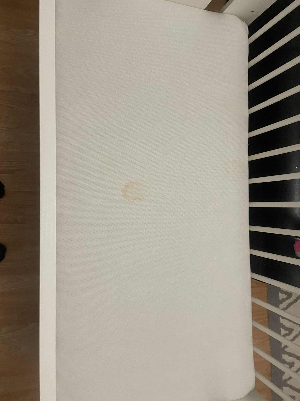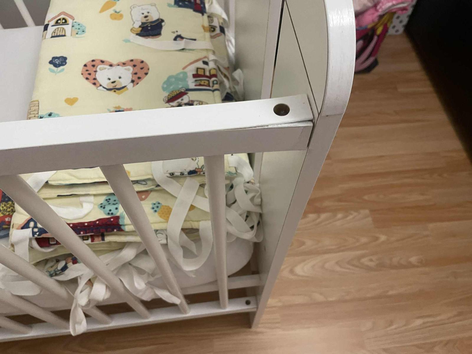 Detská postieľka v dobrom stave použiteľná. Niekde je trošku popísaná je to aj na foto ale nie je to moc vidieť a dno od mokrého fľaky tiež foto (nie je to vidieť tak dobre na foto ) Jeden šrobiče...