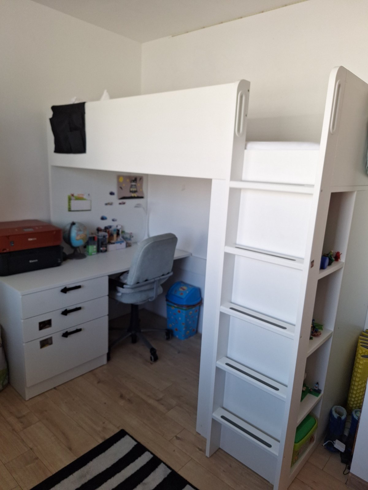 Vyvyšená posteĺ so šmýkalkou. Užívali sme asi rok ako poschodovú posteľ, keďže dole sme dali matrac na zem, čo pre 3 rocneho synceka bolo idealne a 5 rocny spal hore. Postel predavame bez matracov...