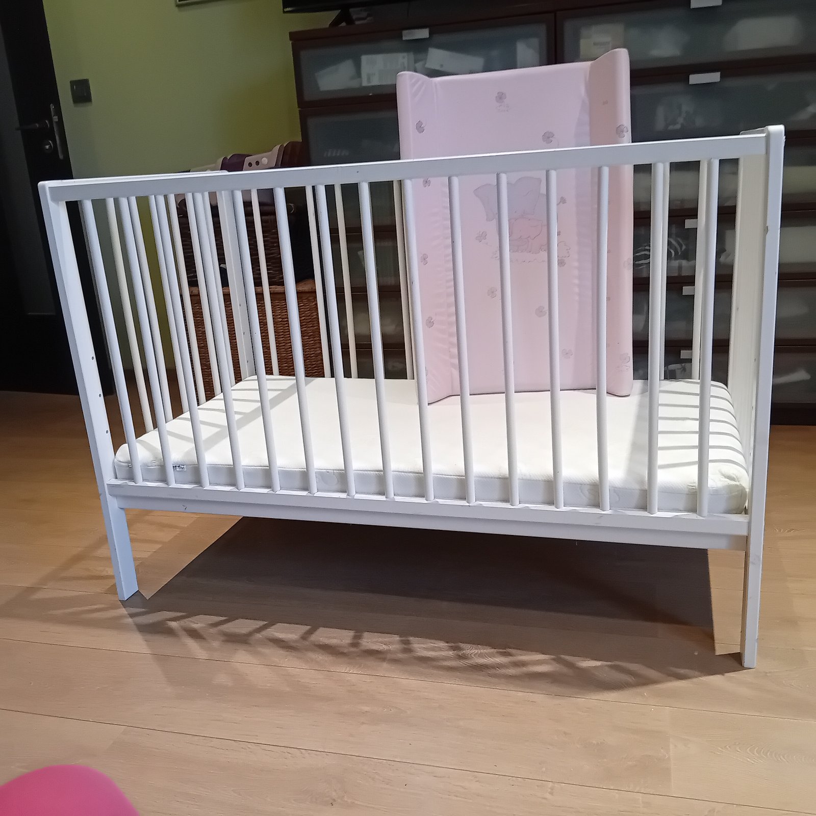 Predám detskú postieľku s ružovými suflikm IKEA,, s matracom a mantinelom