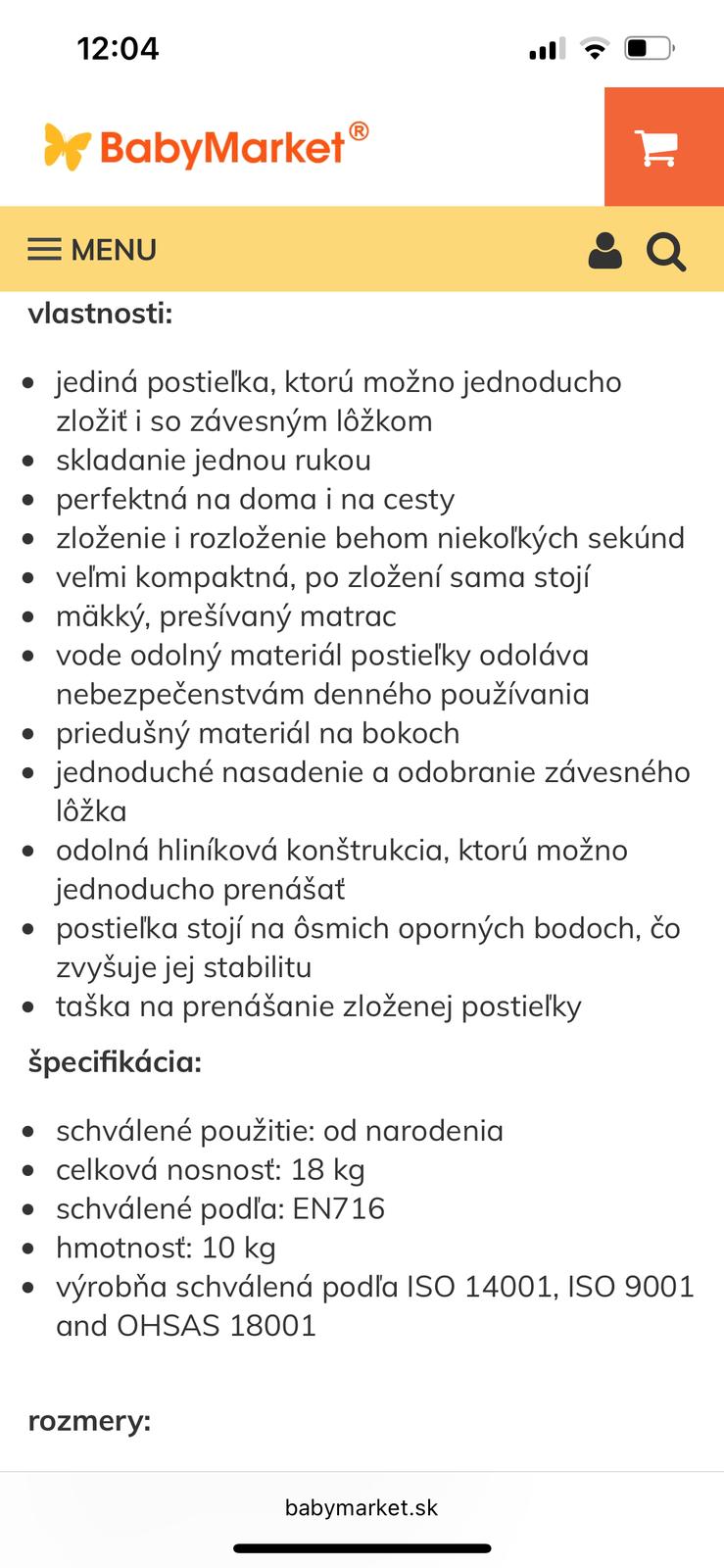 Cestovná postieľka použitá na jednej dovolenke takže ako nová. Má jednoduché skladanie. Hmotnosť 12,5 kg. Rozmery: 114x65x74 cm. Má dve výšky podlahy, prebaľovací pult, otváracie bočné dvierka, sie...