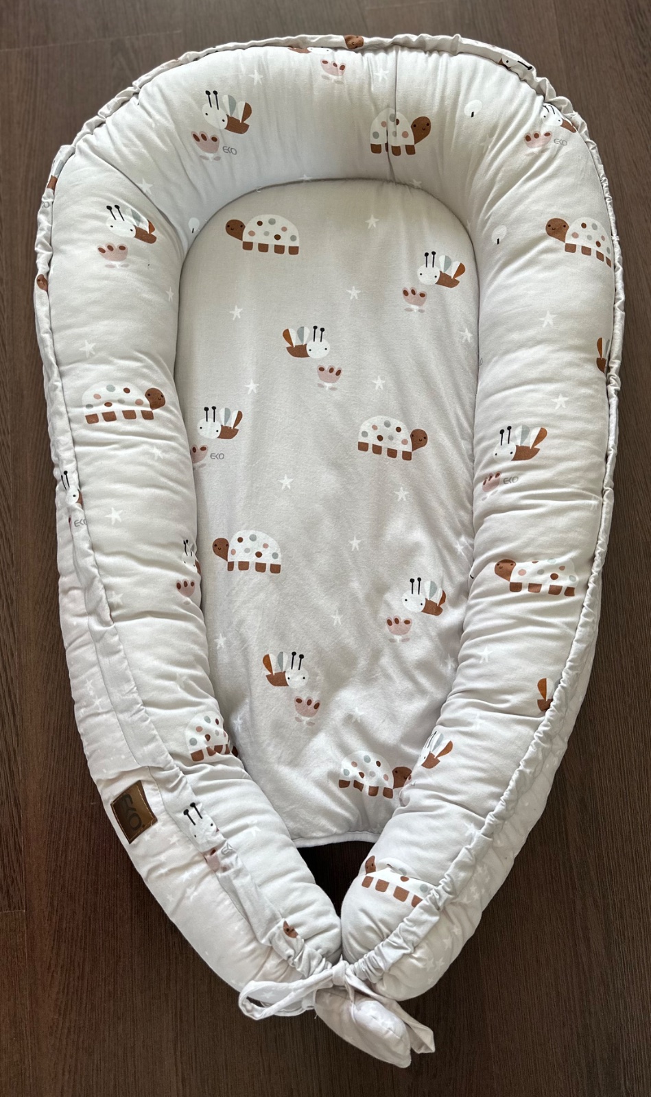 Predávam nové EKO Hniezdo pre bábätko obojstranné bavlnené Bees Stars Beige 90x60 ani raz nebolo použité kupované pred mesiacom v obchode feedo ako darček viď foto. Hniezdo je 100% Bavlna Výplň: silikónová hypoalergénna netkaná textília – 100% Polyester, 100% lentex ball pes hcs silicone polyester.Rozmery: 90 × 60 cm.