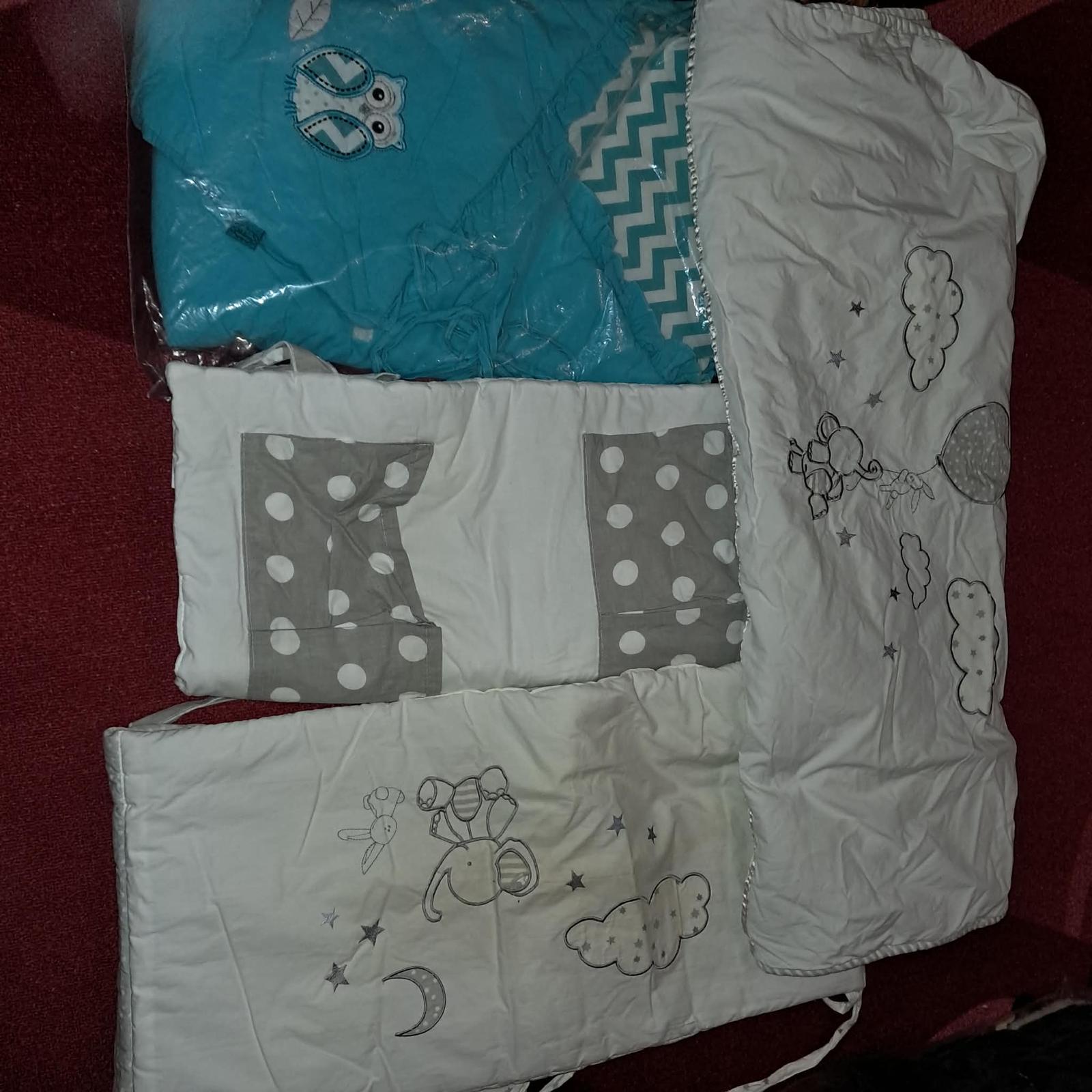 Predám mantinely do postieľky, perinku, vreckár a zavinovačku. Zopár žmolkov, na jednom mieste mantinel trošku zažltnutý, praním to pôjde dole...
