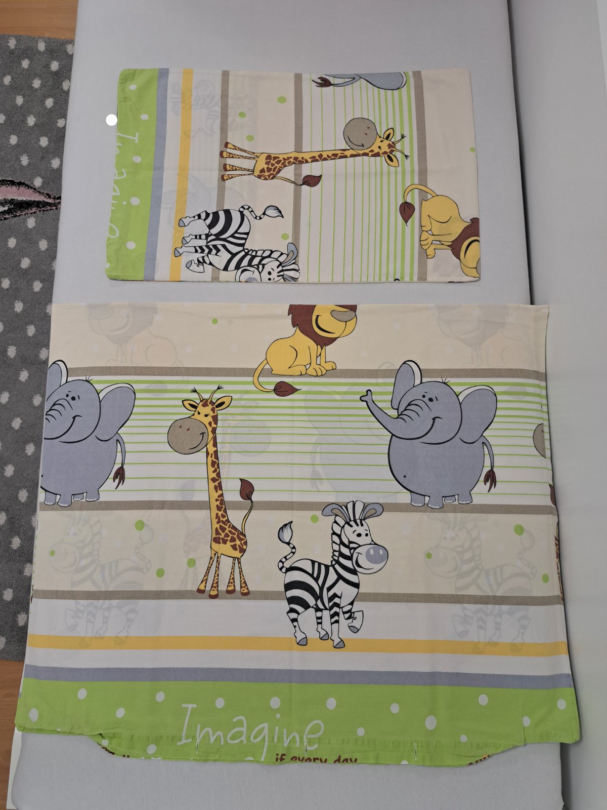 Obliečky sú vo výbornom stave,nie sú vyblednuté ani inak poškodené.Rozmery sú 45x65,90x130.Sú od slovenského výrobcu Praktik textil.