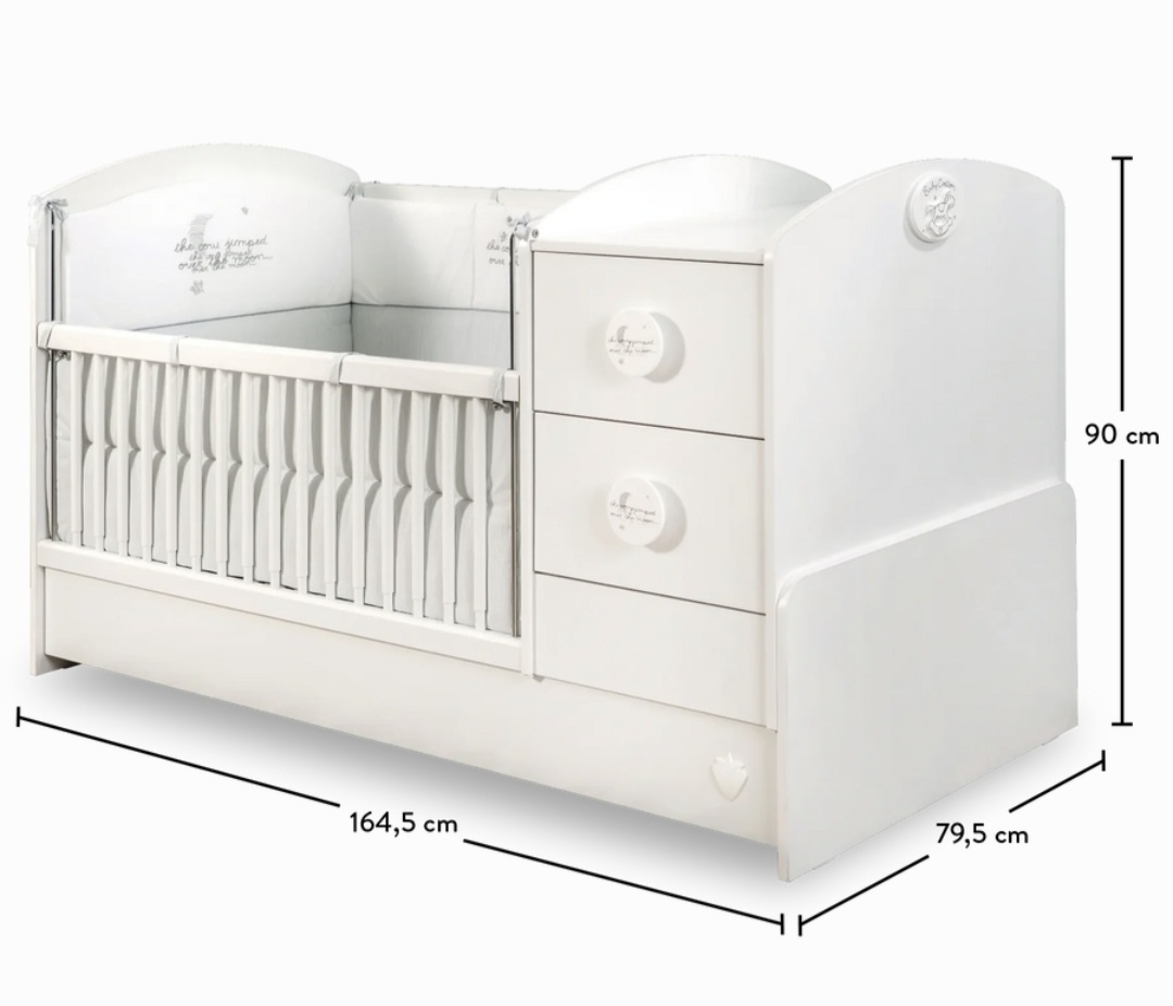 Predám túto nádhernú rastúcu postieľku značky Cilek - baby cotton vhodnú pre dieťa vo veku od 0 do cca 10 rokov. Rozmery sú na obrázku. Postieľka má obrádku, ktorá sa dvíha do rôznych poloh. V neskoršom veku sa táto postieľka dá rozložiť na riadnu detskú posteľ. Ak budete chcieť aj matrac (ktorý je bez škvŕn ale používaný) pretože posteľ má atypické rozmery a je ťažké kúpiť matrac v týchto rozmeroch. Pôvodná cena bola 369€ bez matraca a bielizne a baldachynu. Ak budete chcieť kompletne všetko ako na obrázku napíšte mi správu. V cene je aj matrac ale bez baldachynu a bielizne.