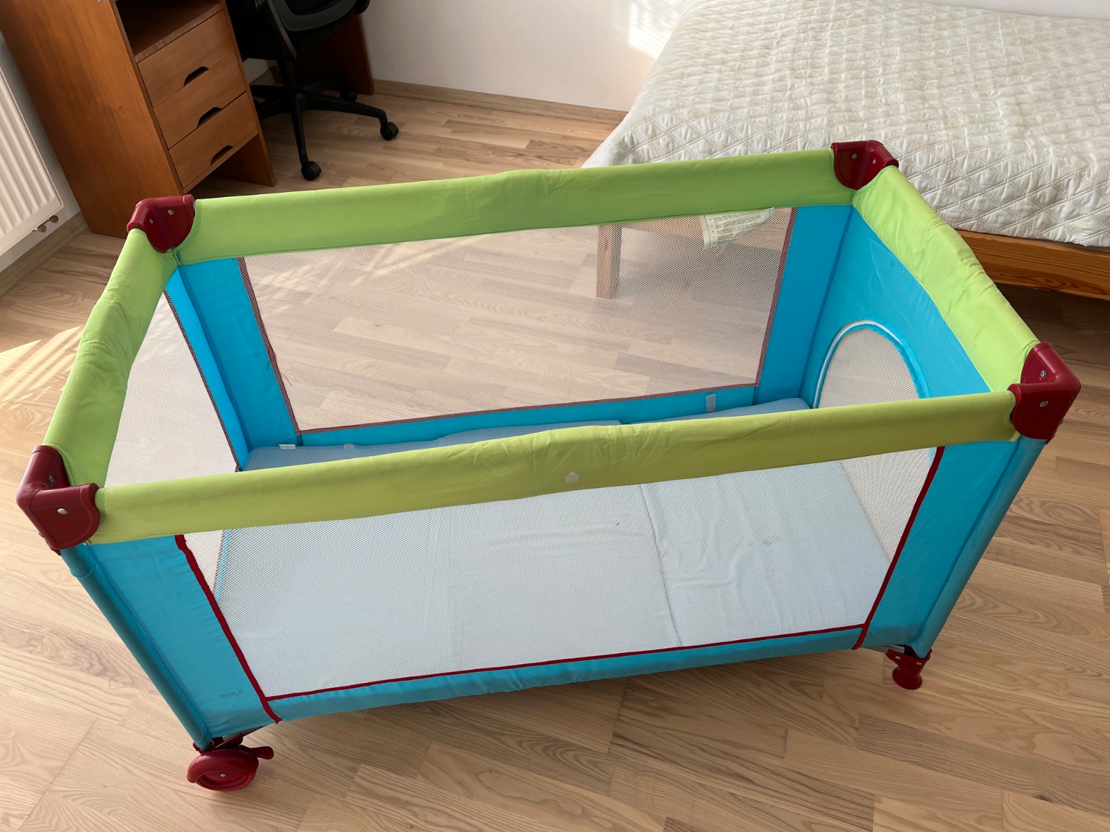 Predám farebnú cestovnú postieľku XXXLutz, rozopínateľné zipsové okienko, nosnosť do 25kg, matrac s prateľným poťahom.