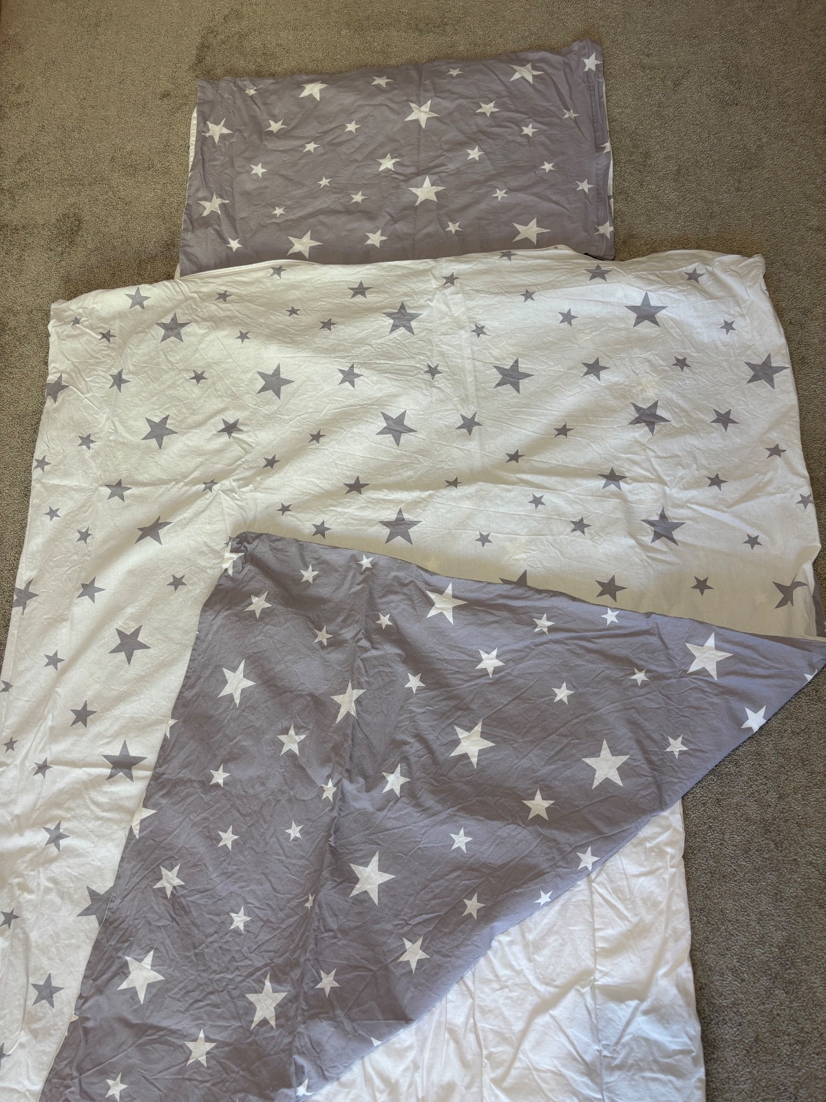 Úplne nový komplet do detskej postieľky. Vhodné pre dievčatko aj chlapca. My sme mali viacero kompletov a tento zostal zabudnutý v skrini, takže všetko je úplne nové.