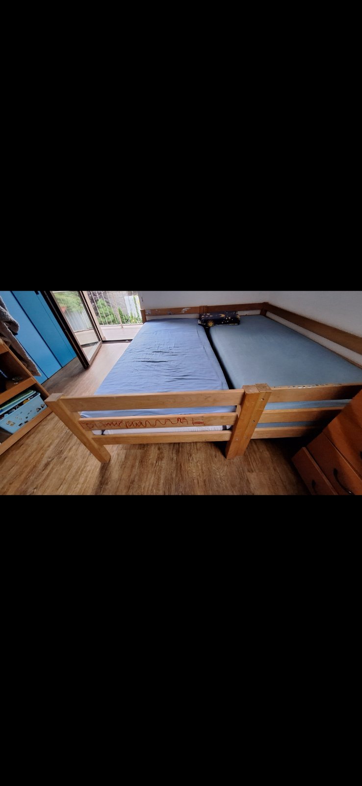 Predám kvalitnú drevenú poschodovú posteľ, spolu s matracmi, rozmer postelí je 90x200 cm. Momentálne ju mame rozobratu na dve samostatné postele, všetko príslušenstvo je zabalené. Zmontovaná vyzerá ako na je znázornené na prvom obrázku. Cena je posteĺ + 2 matrace.
