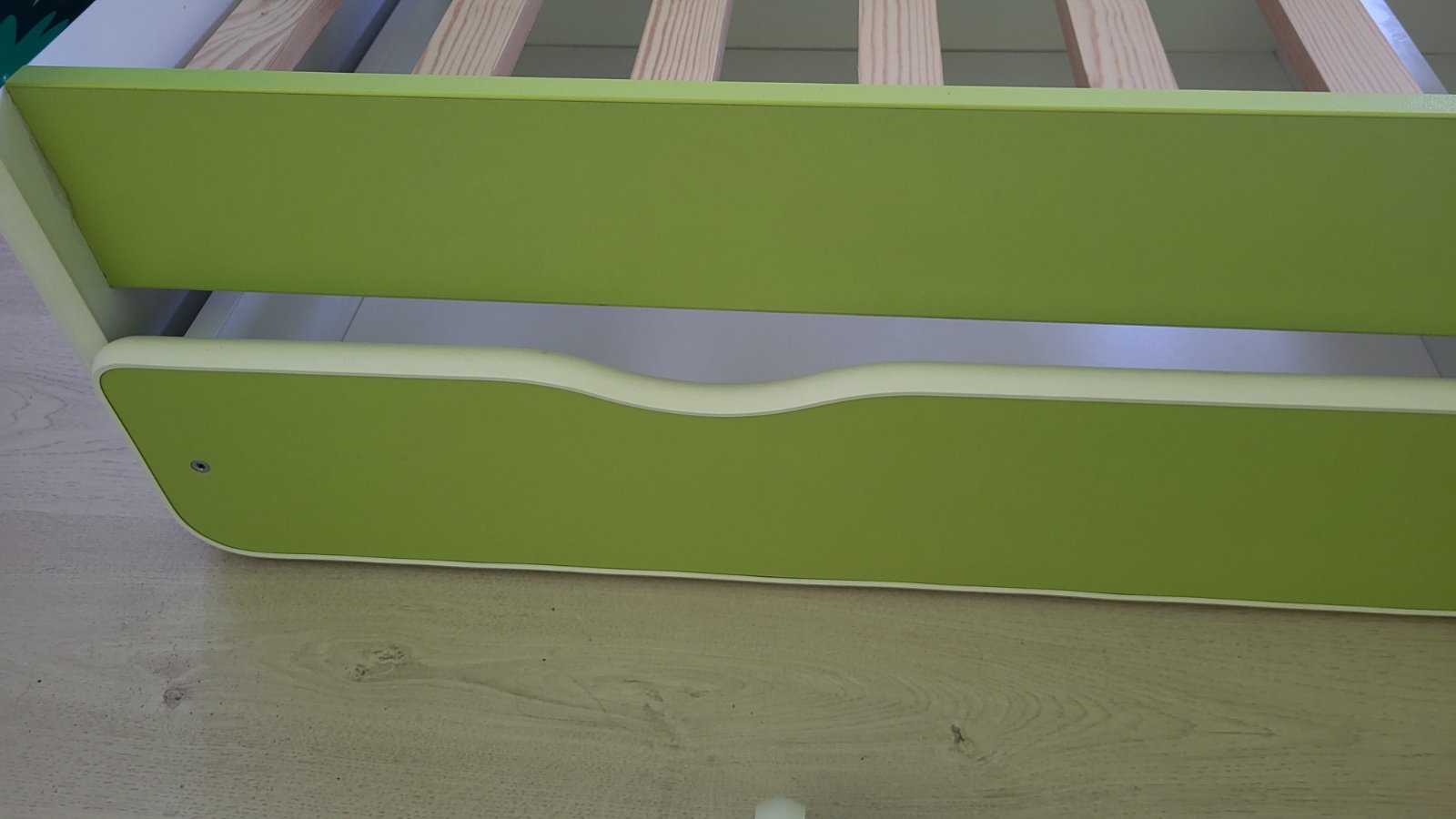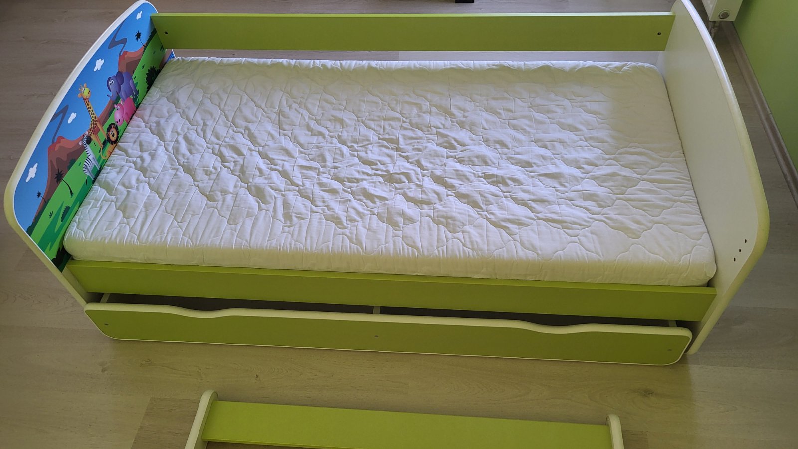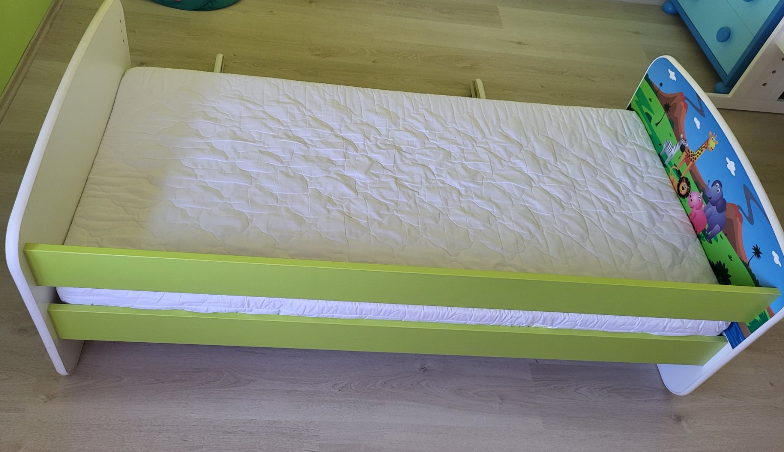 Destká postieľka zn. Babynabytek. Krásna, vo výbornom stave. Jediná vada je nalomená jedna lišta z roštu. Cena je vrátane roštu a matracu, zásuvky na kolieskach a zábrany. Je to antialergický matrac s kokosovým vláknom. Posteľ je dlhá 160 cm, šírka bočného panelu je 90 cm, matrac má 80 cm. Nutný osobný odber v BA - Karlova Ves.