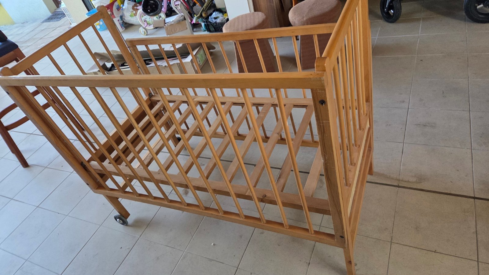Drevenna postielka bez chyb s matracom aj s bielou plachtou.Da sa prisposobit na dve vysky a ked je dietatko vacsie daju sa vybrat 3 stredove tycky ( vid foto) aby mohlo vychadzat.