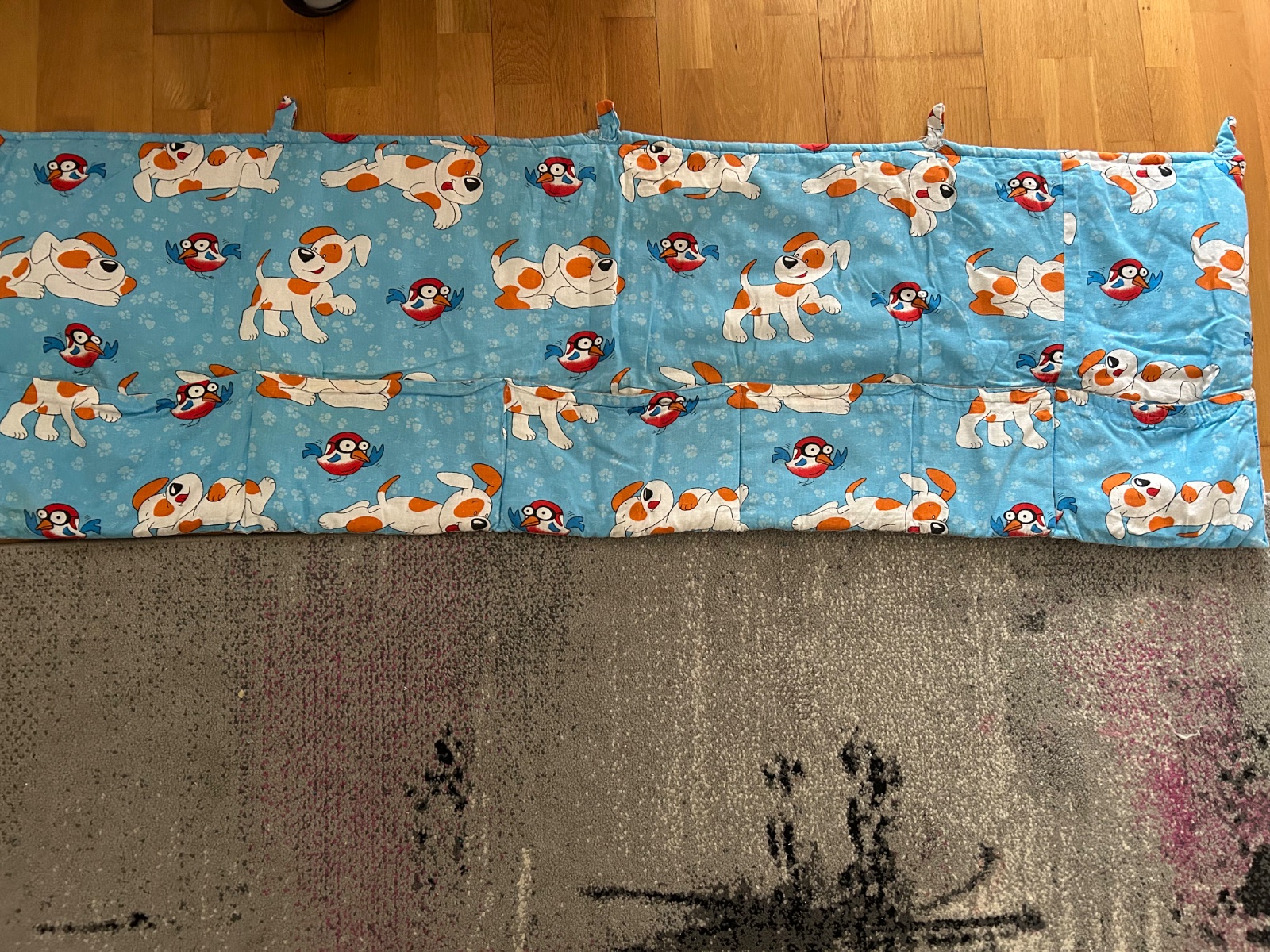 Zastena za detsku postel s vreckami. Dlzka 154, vyska 50 cm. Oprata. Cena orientacna, dohoda.