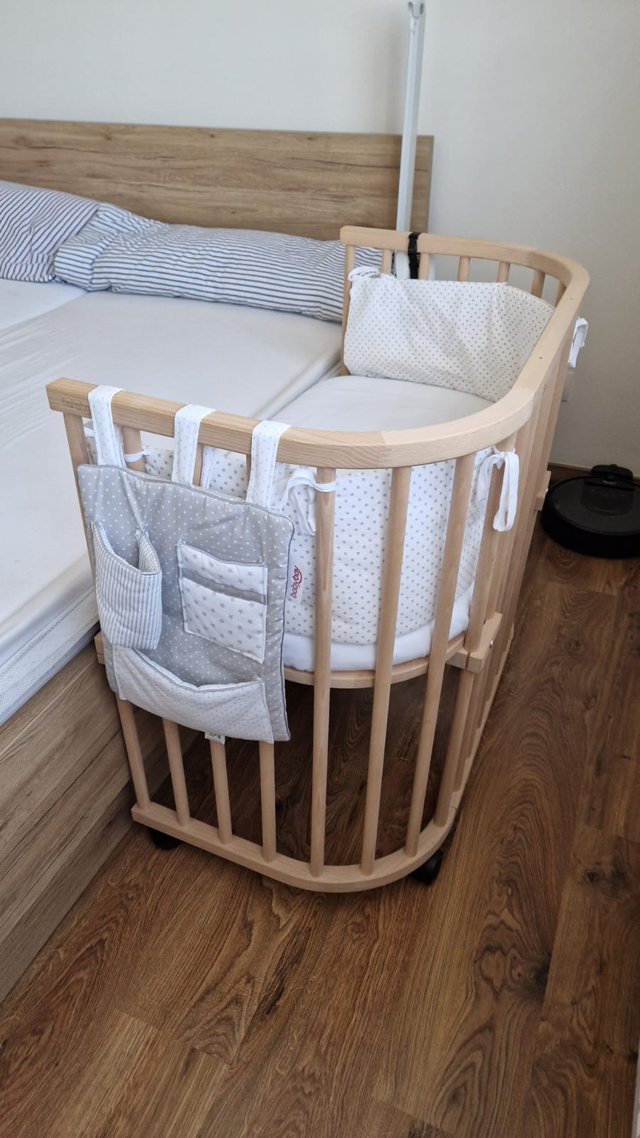 Predám originálnu detskú postieľku BabyBay - Eko verzia neupravovaný buk - 96x54x79cm (D x Š x V). Nastaviteľná výška, pripája sa k posteli. Používaná ale stále vo veľmi dobrom stave. Výbava: originál BabyBay matrac Medicott extra priedušný + 2 plachty (froté biela, biela), zábrana (neupravovaný buk), mantinel BabyBay, organizér na postieľku, kolieska.