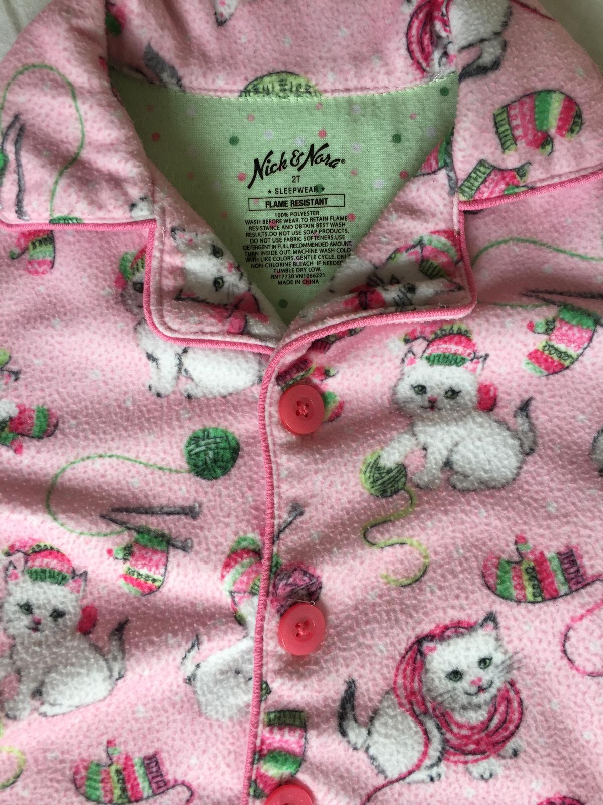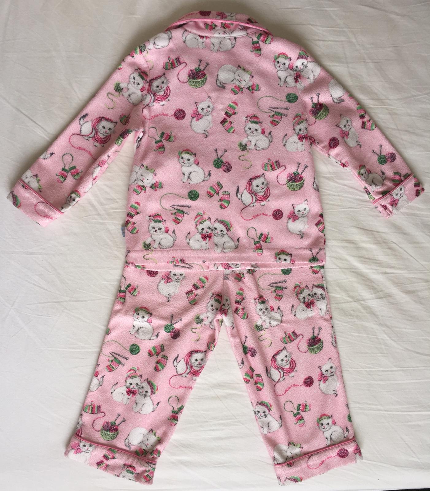 Milené teplulinké pyžamko s motívom mačičiek. Ohňuvzdorné, kupované v USA. Zapínanie na gombíky, v páse nohavíc všitá gumička. Bez poškodenia, len minižmolky.
