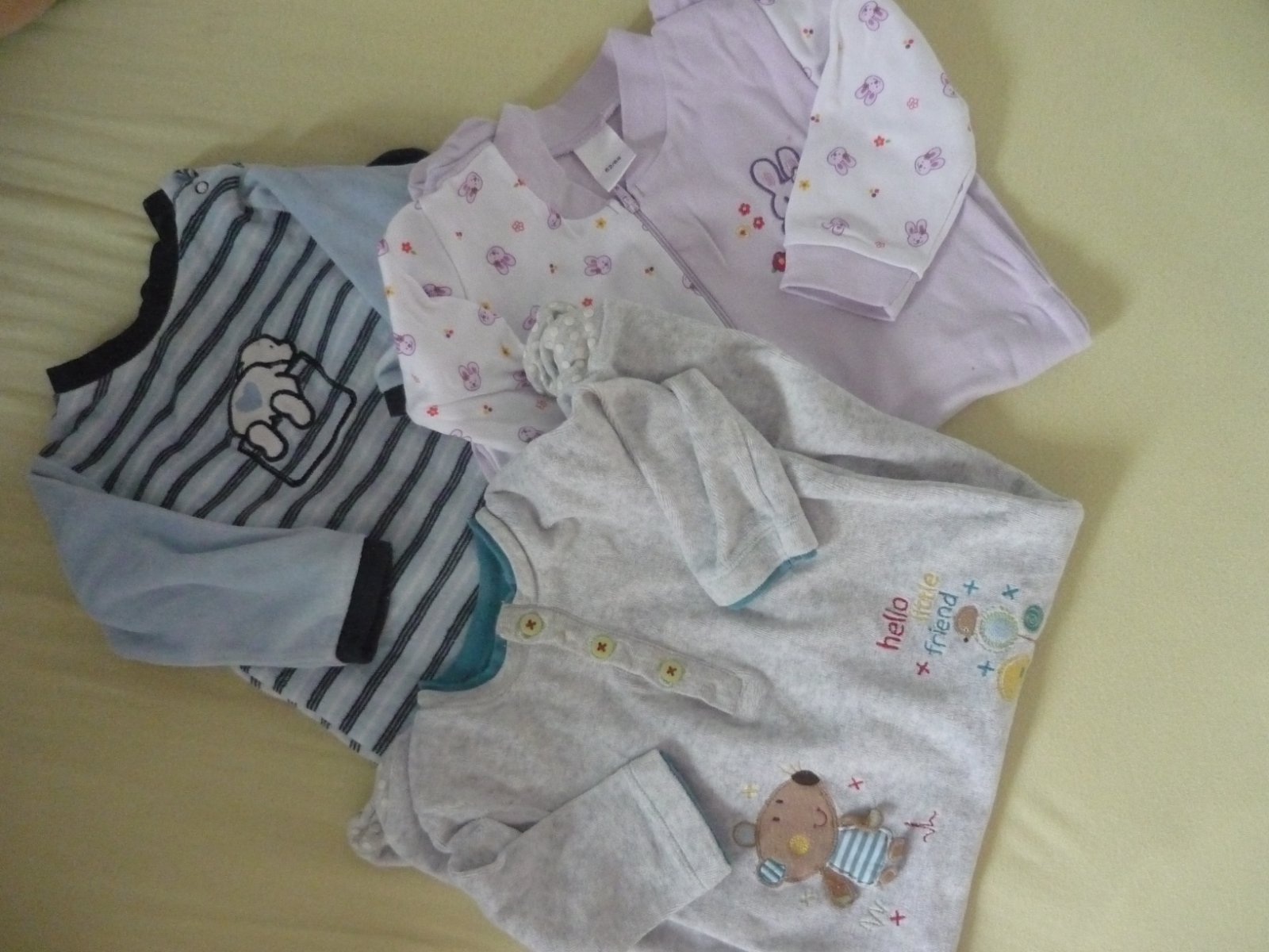 Predám overaly na spanie. Modrý a šedý sú teplejšie zo zamatovej látky. Fialový na zips je z jemnej bavlny. Šedý overal "hello little friend" je na cca 6 - 9 mesiacov. Cena za kus 2€.
