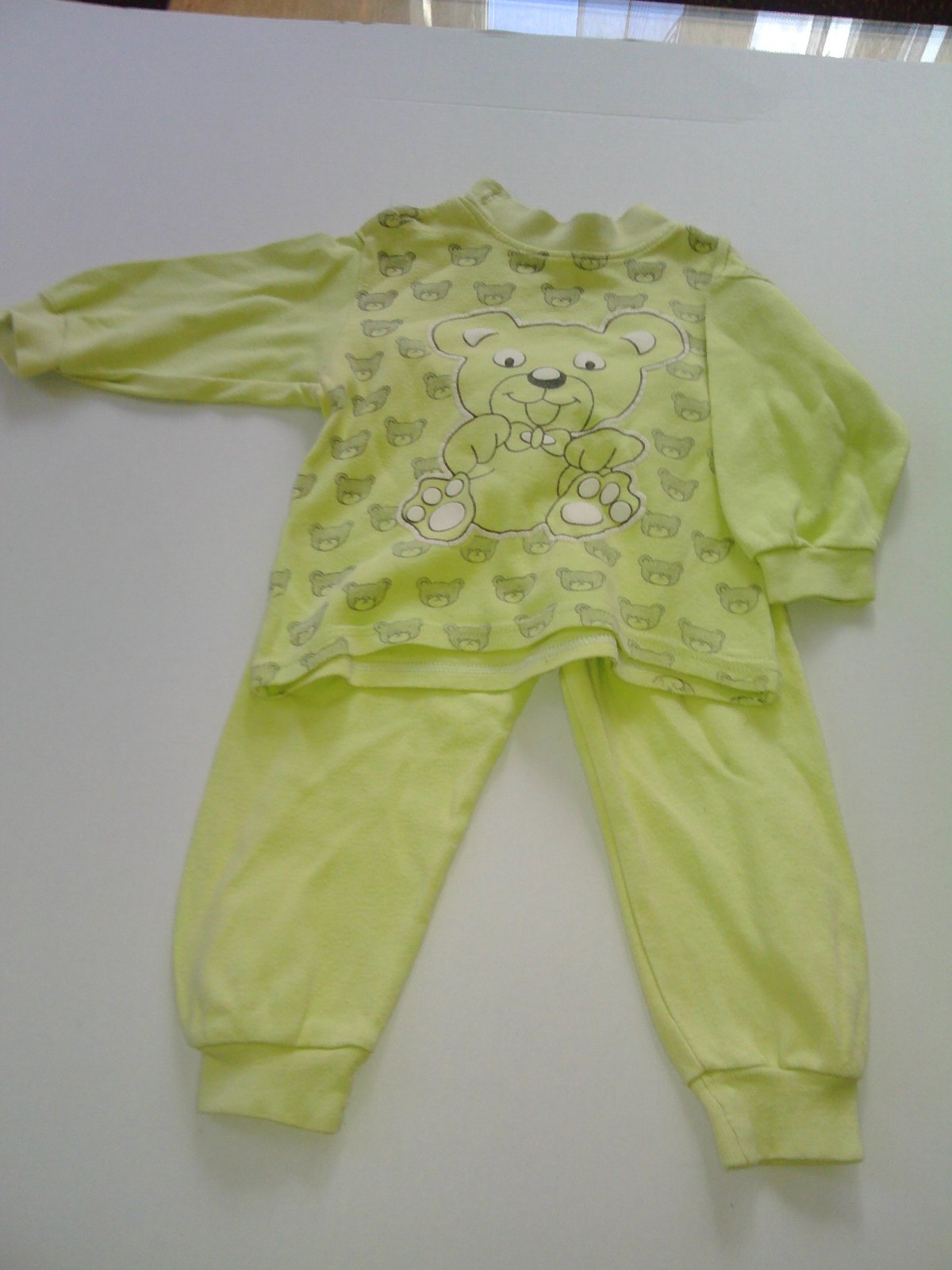 Nosené pyžamko s medvedíkmi. Veľkosť 74. Pre istotu zmerané,šírka vrchného dielu 28cmx2 a dĺžka 32 cm, dĺžka nohavíc 40cm a šírka v pase 17cmx2. Má minižmolky.