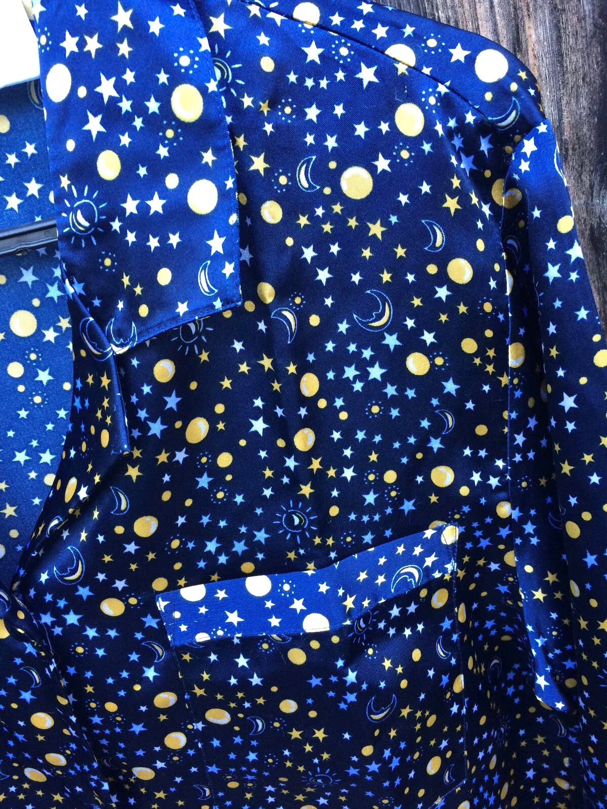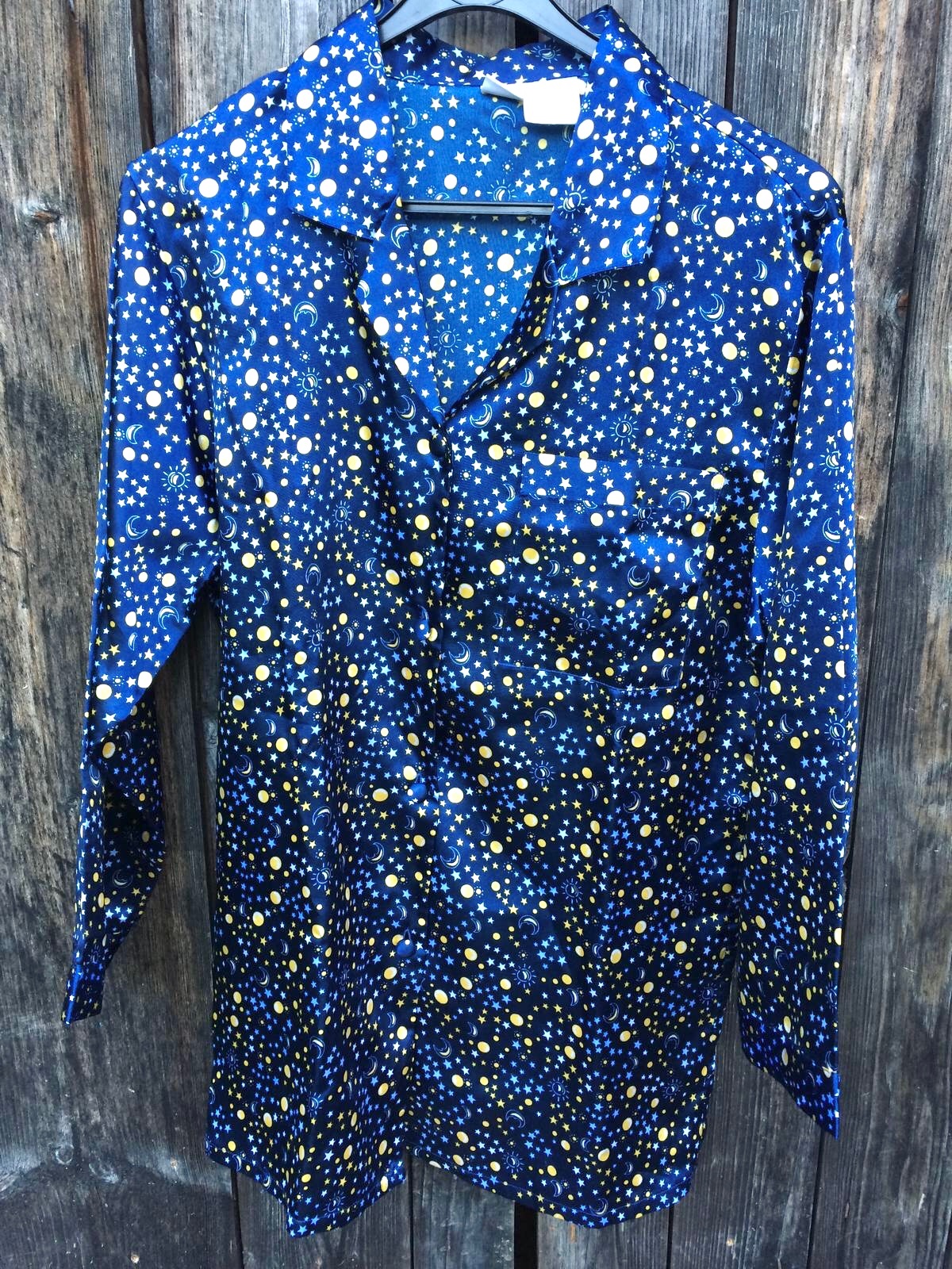 Satenove pyzamo s potlacou "nocnej oblohy" 🙂.Velkost uvedena 36-38,ale je urcite vacsie,tak 38-40.Bolo parkrat oblecene.