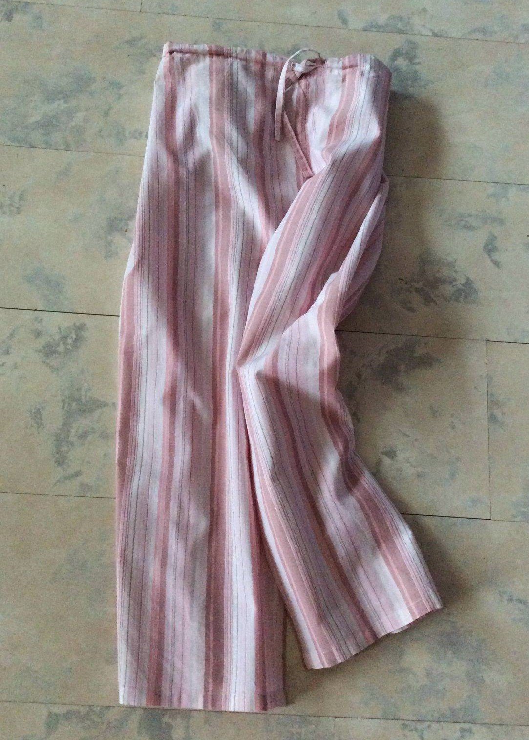 jemná bavlna,neznosené,v zadnej časti gumička,v prednej viazanie,dlžka = 70 cm, pás = 40 - 43 x 2 cm, boky = 56 x 2 cm,noha dolu šírka = 26 cm