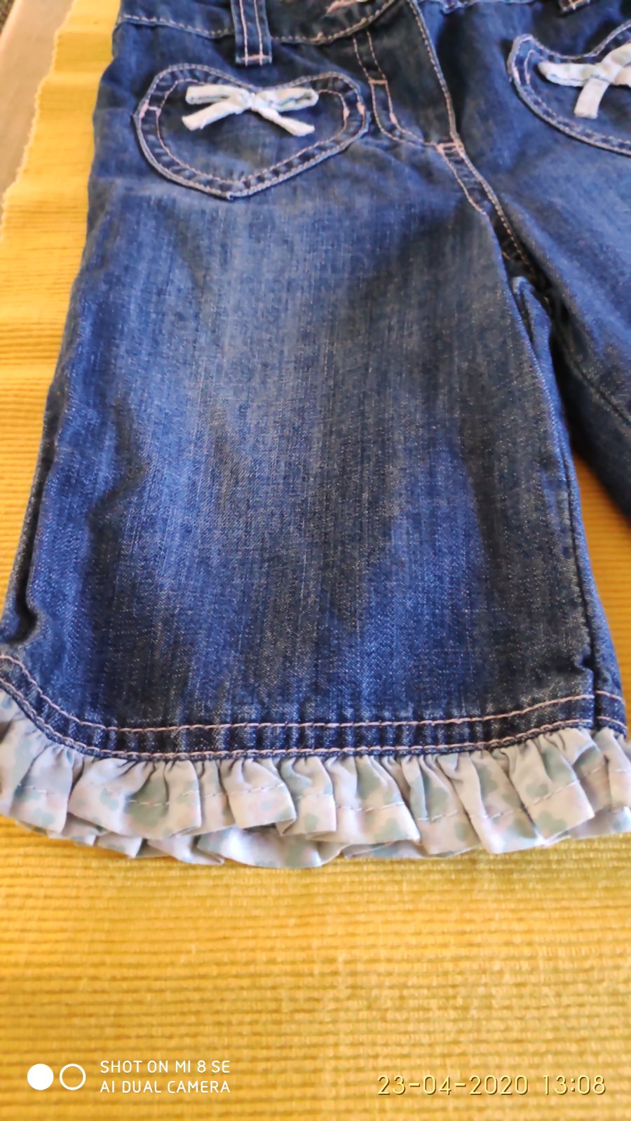 Príjemné 3/4 rifličky pekného strihu a pekných detailov.Pás na posuvnú gumu.Nosenie nie je vidieť. Celková dĺžka:44cm, pás max.2x26cm, šírka cez boky: 2x31cm