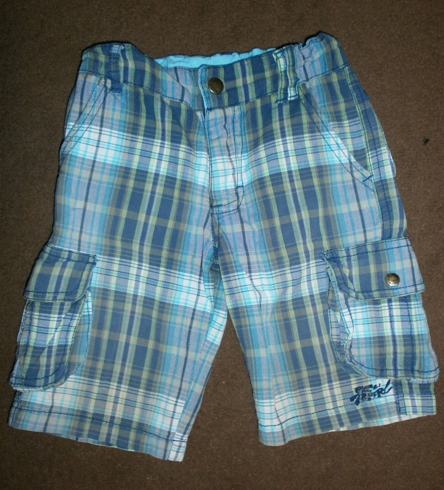 kraťase veľkosť 104, pás na regulovatelnú gumu, zapínanie na háčik a zips. V predu, vzadu a na bokoch vačky. Farba biela, bledomodrá, tmavomodrá, zelená. Na pohlad viac zelenšie ako na fotke, tie zelené pásiky odfotilo bledé. Dobrý stav bez poškodení.