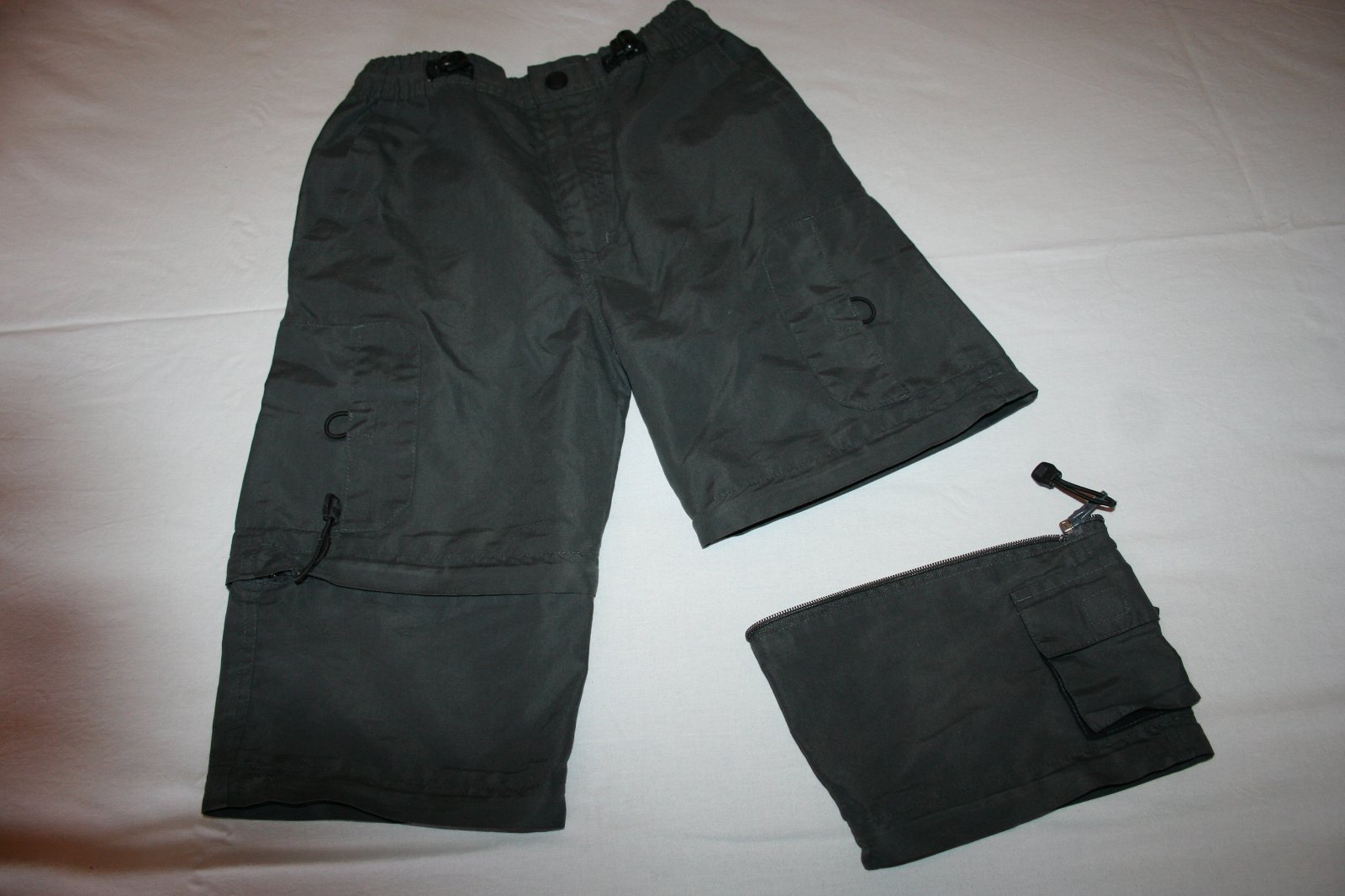Predám praktické tmavošedé nohavice pre chlapca, ktoré rastú s vaším dieťaťom! Vďaka skrytému zipsu na nohách ich v sekunde zmeníte z trištvrťákov na klasické kraťasy. Sú vyrobené z odolného materiálu, ideálne na turistiku, tábory alebo len tak na ihrisko.