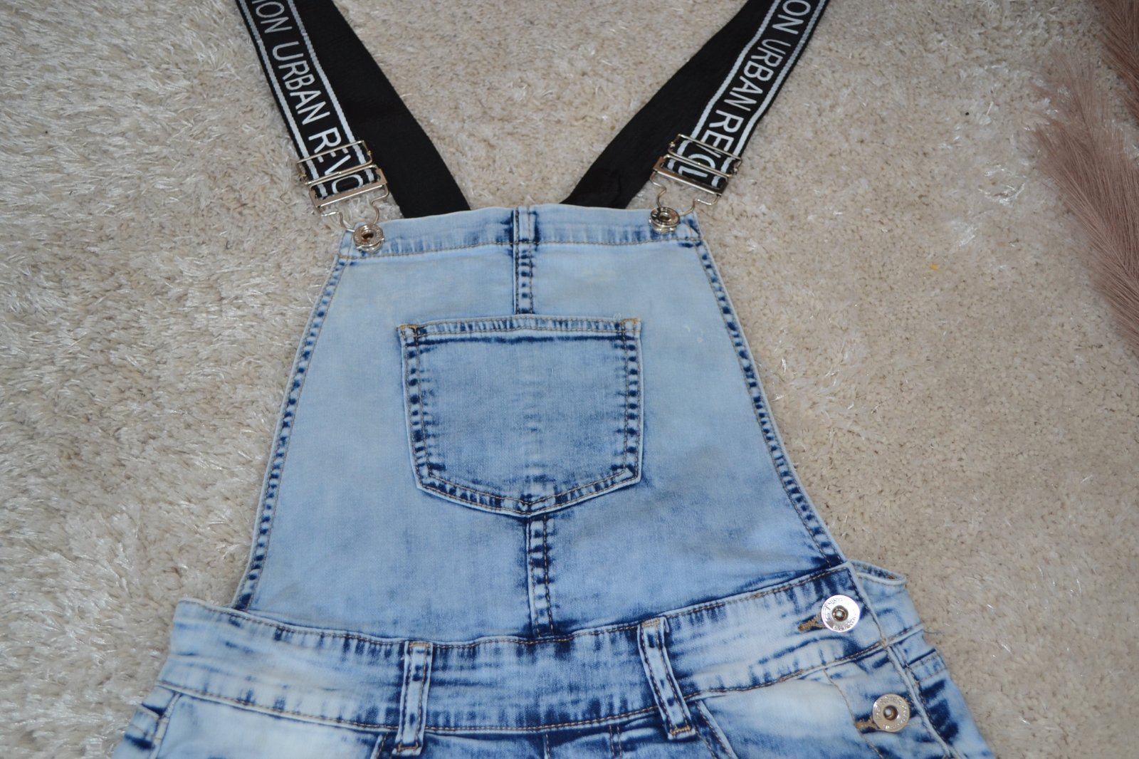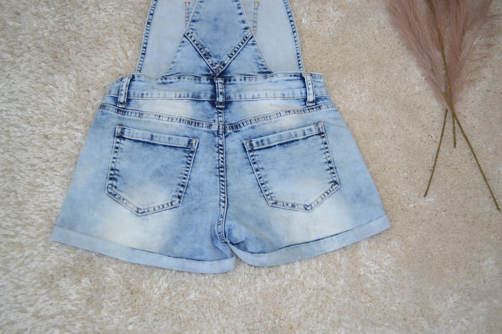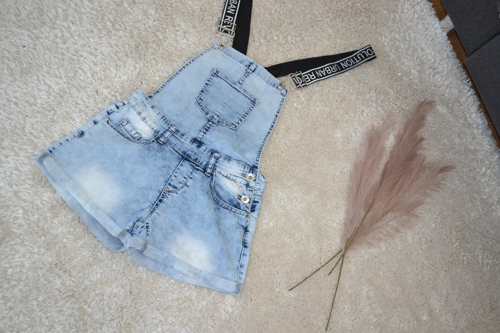 Par x oblečené riflové šortky,skôr volnejsi strih, nie su obtiahnute. Sú s vyšším pásom na gumičku, v kľude šírka v pase 33 cm, natiahnu sa až na 39 cm.