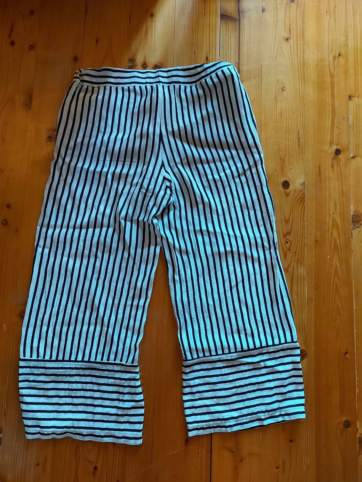 3/4 pruhované bielo-čierne nohavice ZARA, letné, padavá látka, š.-39-do zadného pásu všitá guma-povoľné, d. nohavice od rozkroku-55