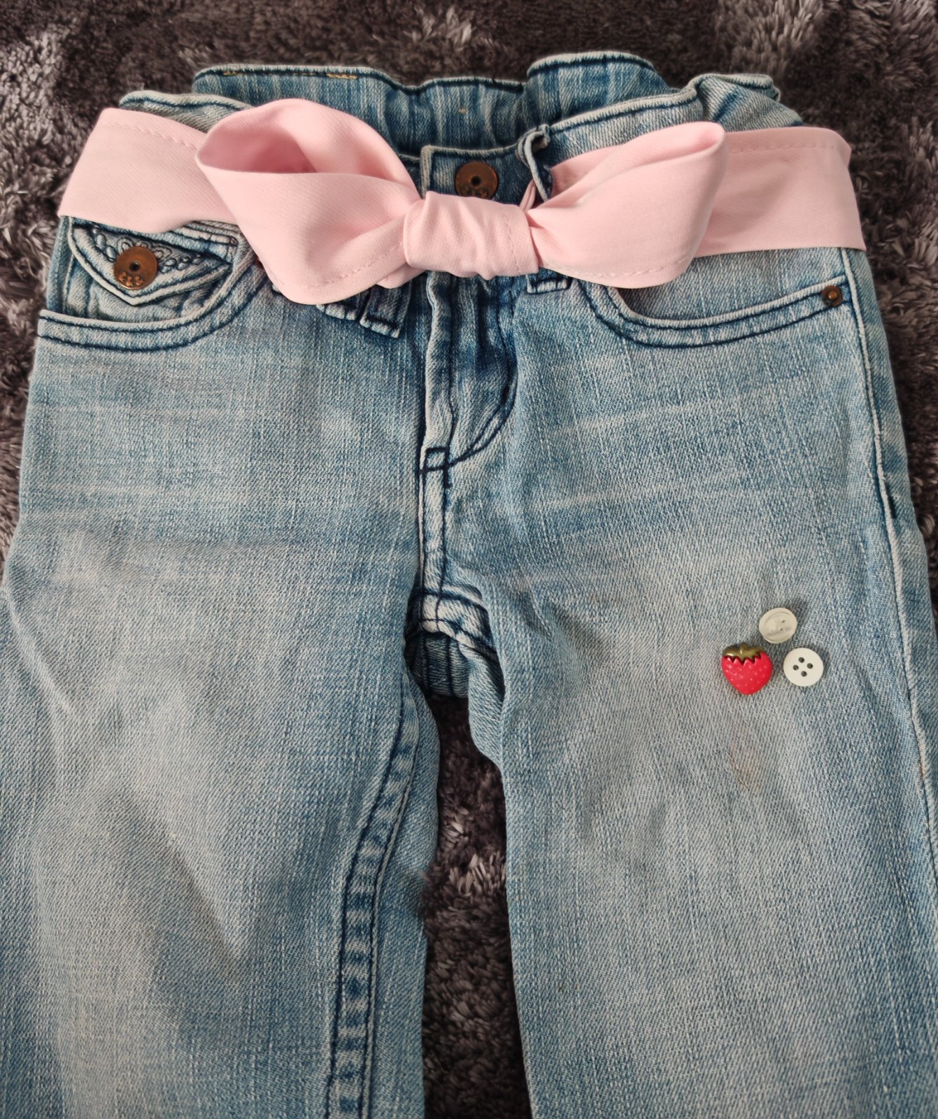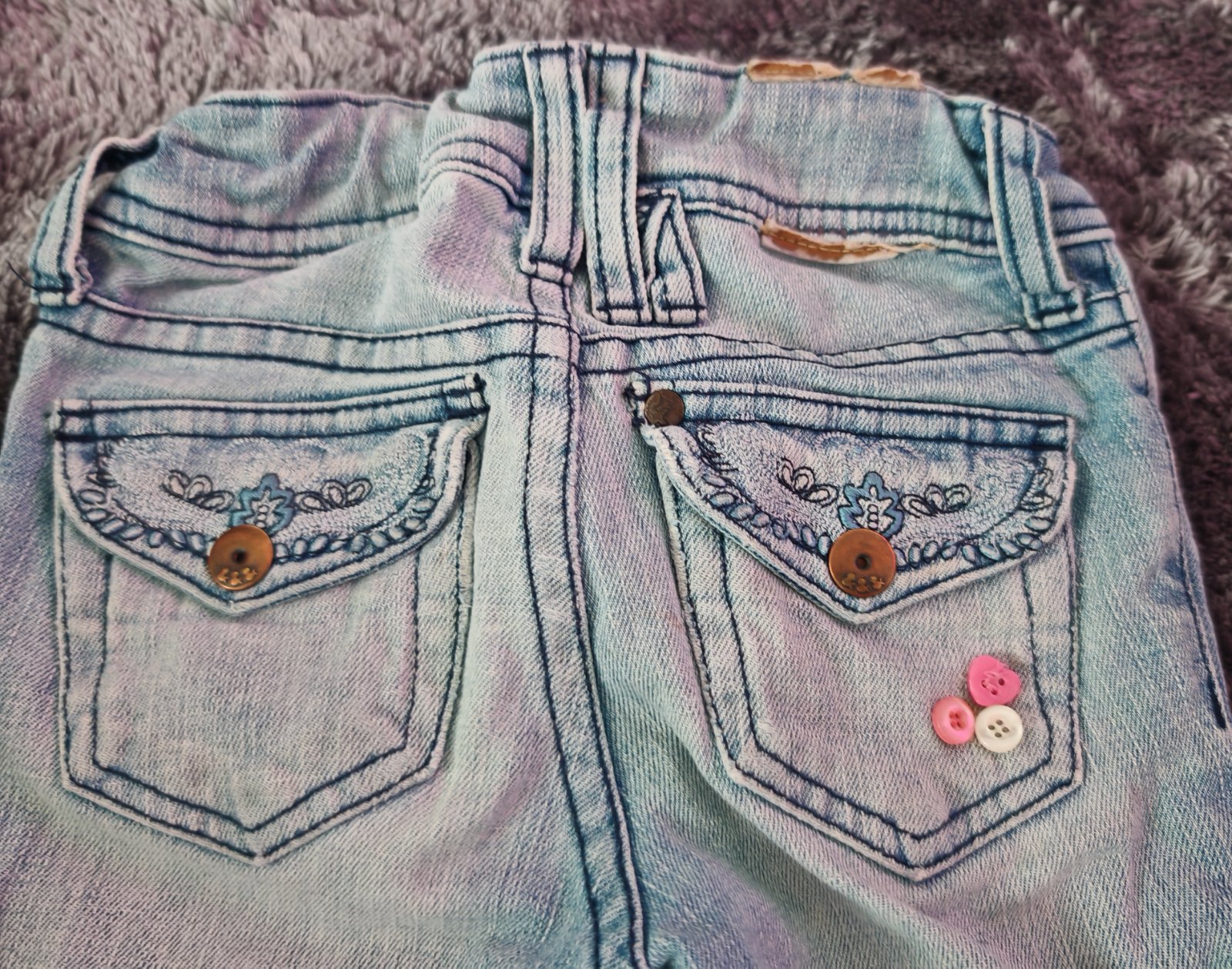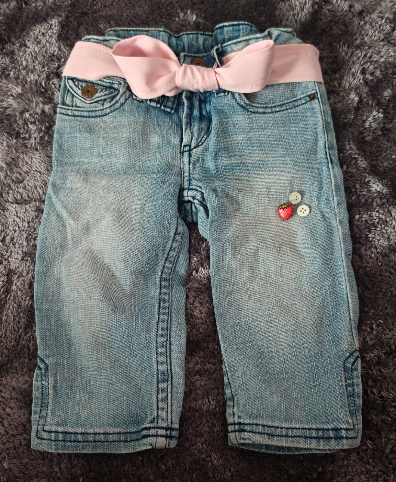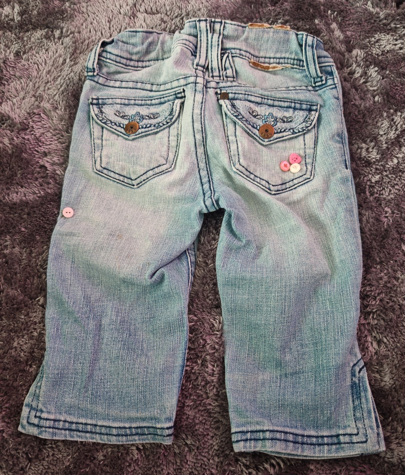 Blede,suchane 3/4 rifliky,zapinanie na dve patentky,dole po bokoch su rozstrihnute,vzadu ozdobne vrecka,pas ma regulaciu,pruzia len jemne.nosene,vpredu a vzadu nejaky flak-skusim odstranit alebo nasijem gombiky-vid foto,inak su pekne,pisana velkost 116,dcerka nosila dlhsie