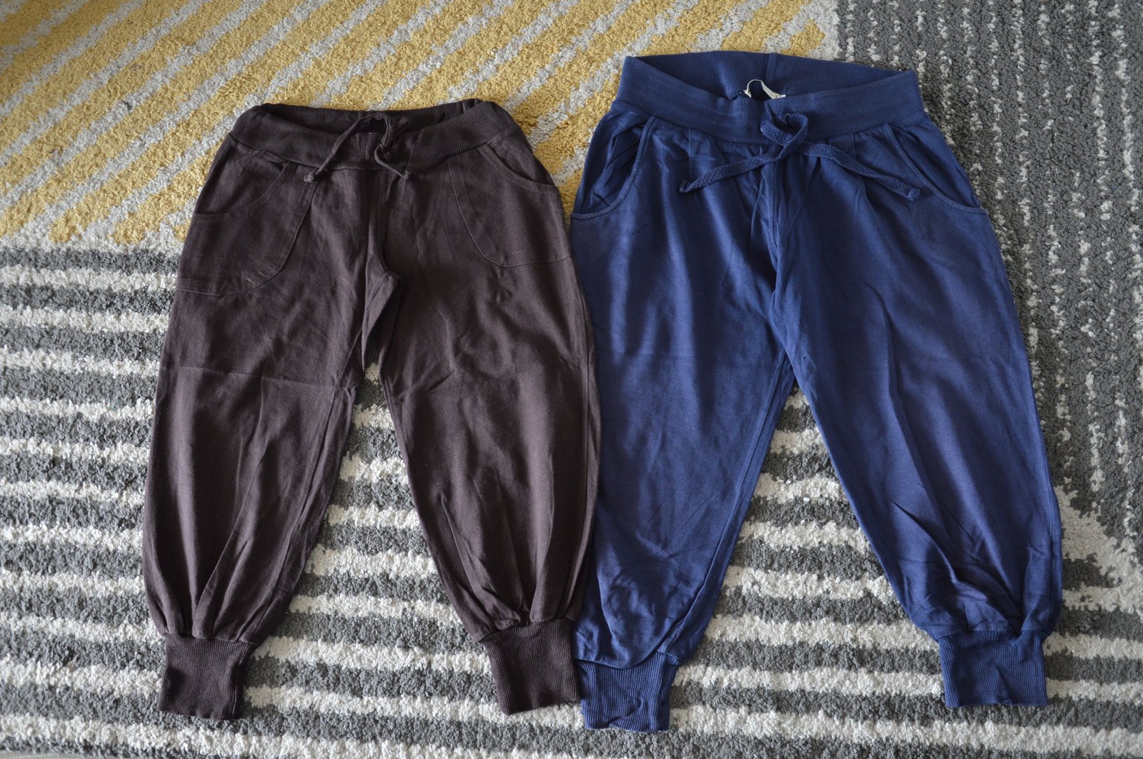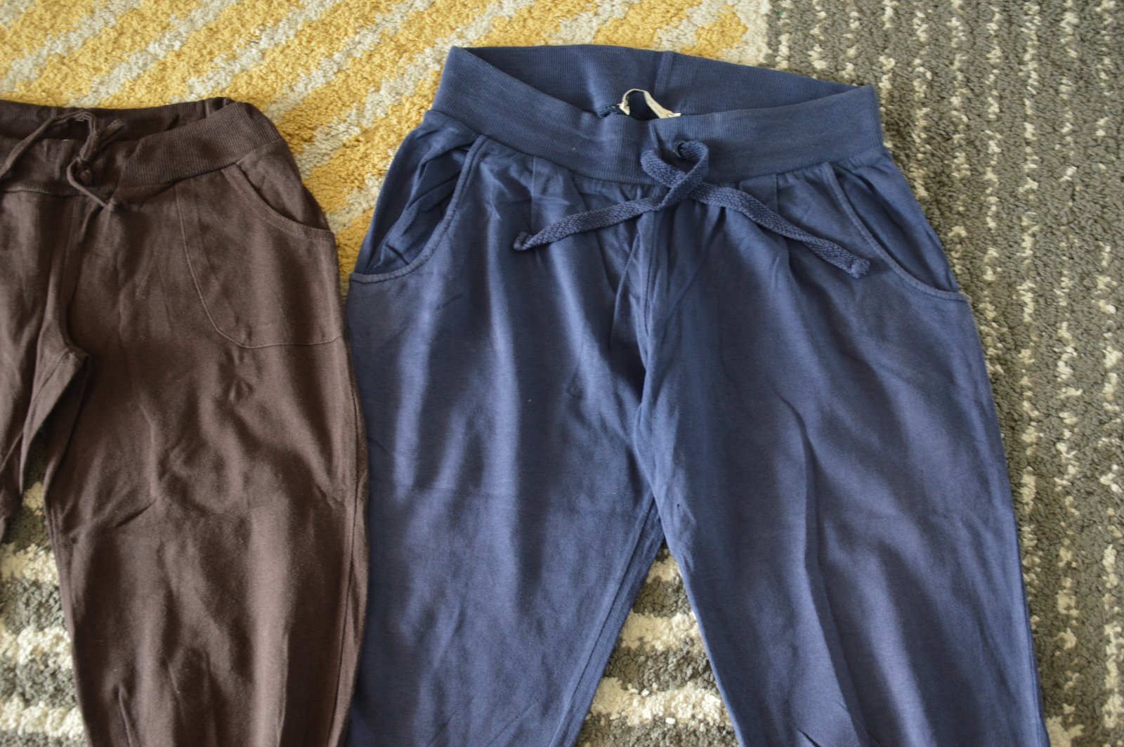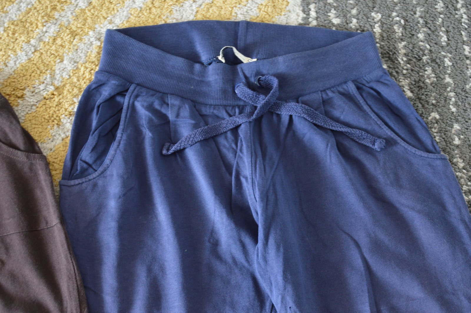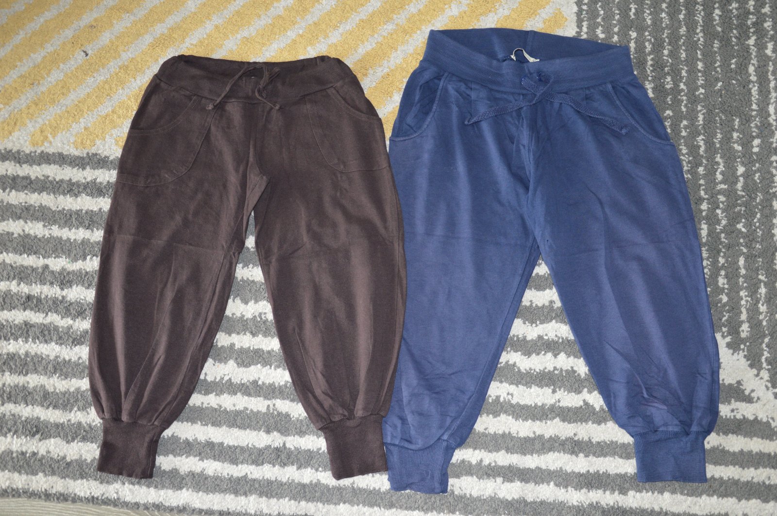 Pekný stav, bavlnené, bledšia farba, pekne ukážu, bez žmolkov, držia tvar, funkčné šnúrky v páse, na modrých jedna dierka pri rozkroku, hnedé Fishbone, modré Bershka,