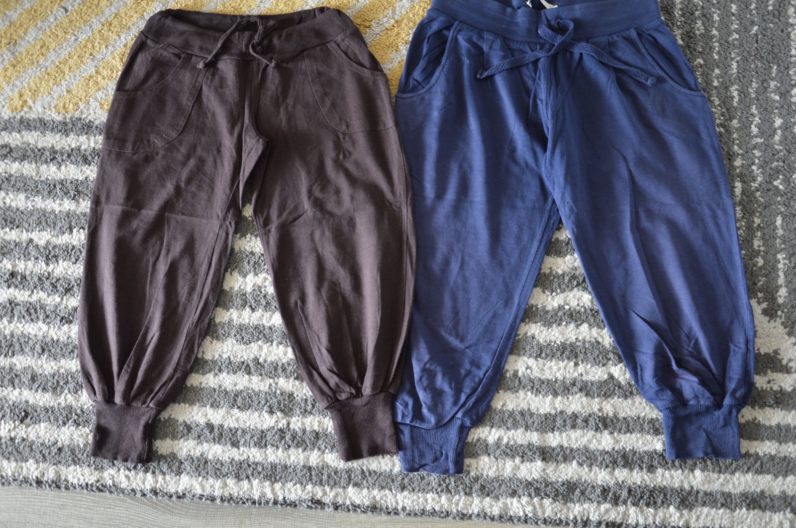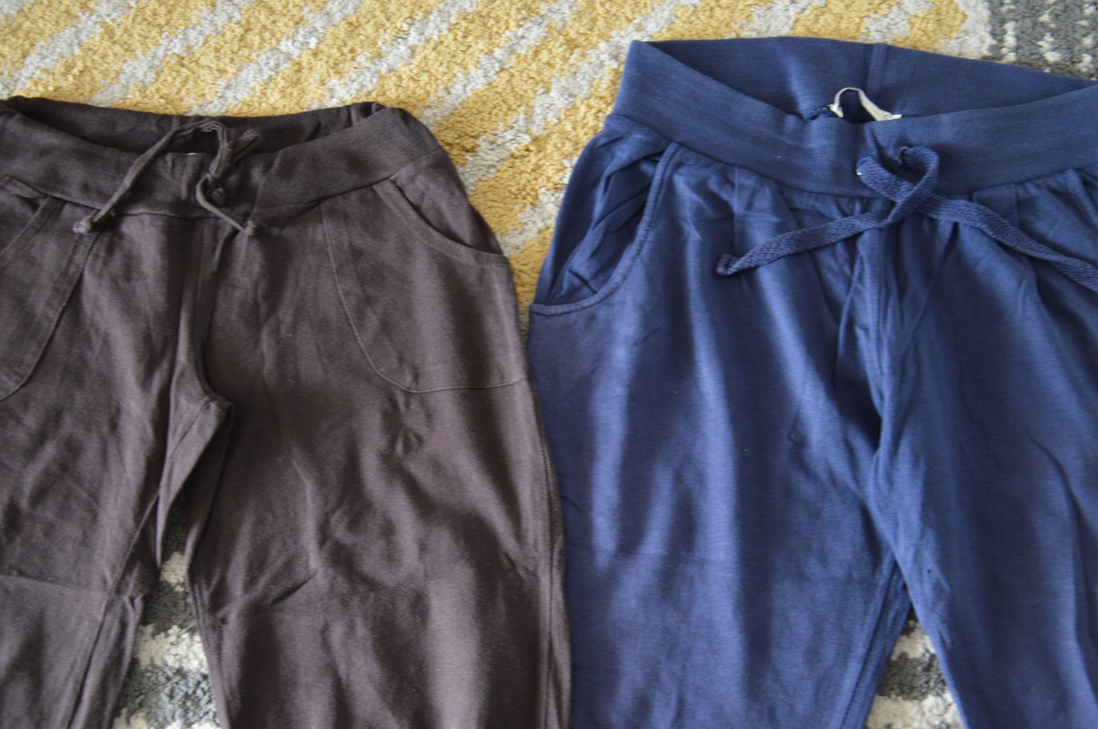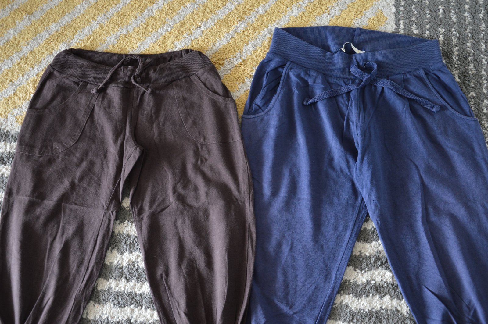 Pekný stav, bavlnené, bledšia farba, pekne ukážu, bez žmolkov, držia tvar, funkčné šnúrky v páse, na modrých jedna dierka pri rozkroku, hnedé Fishbone, modré Bershka,