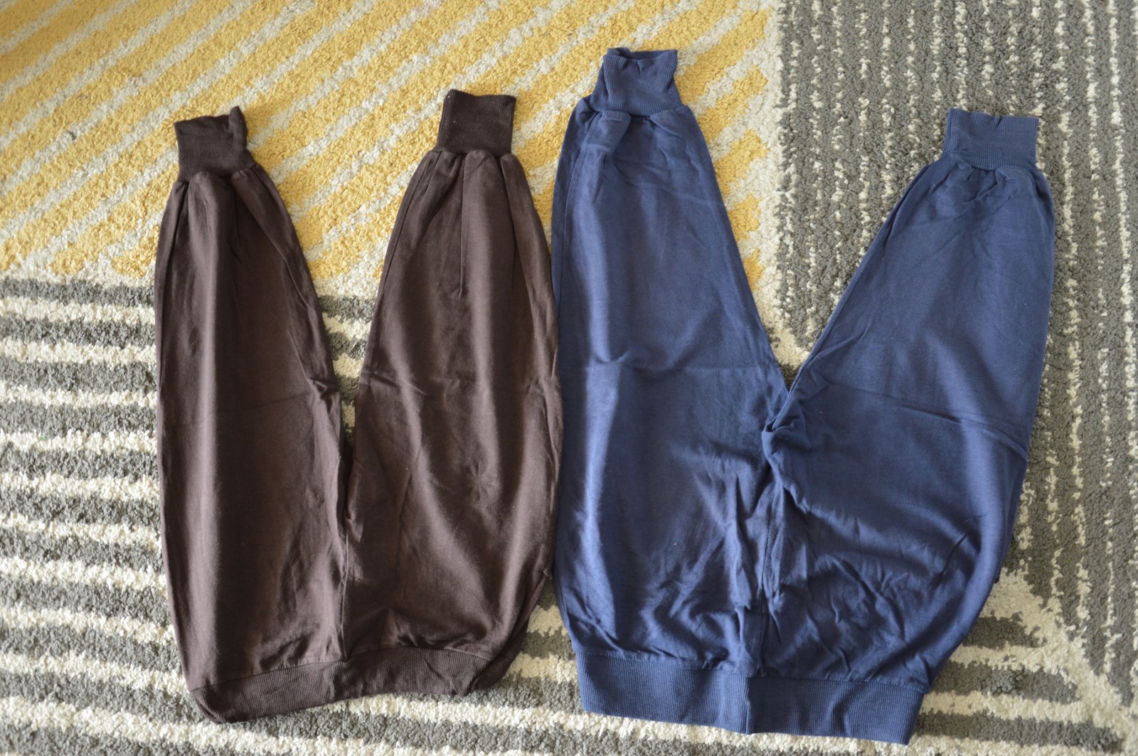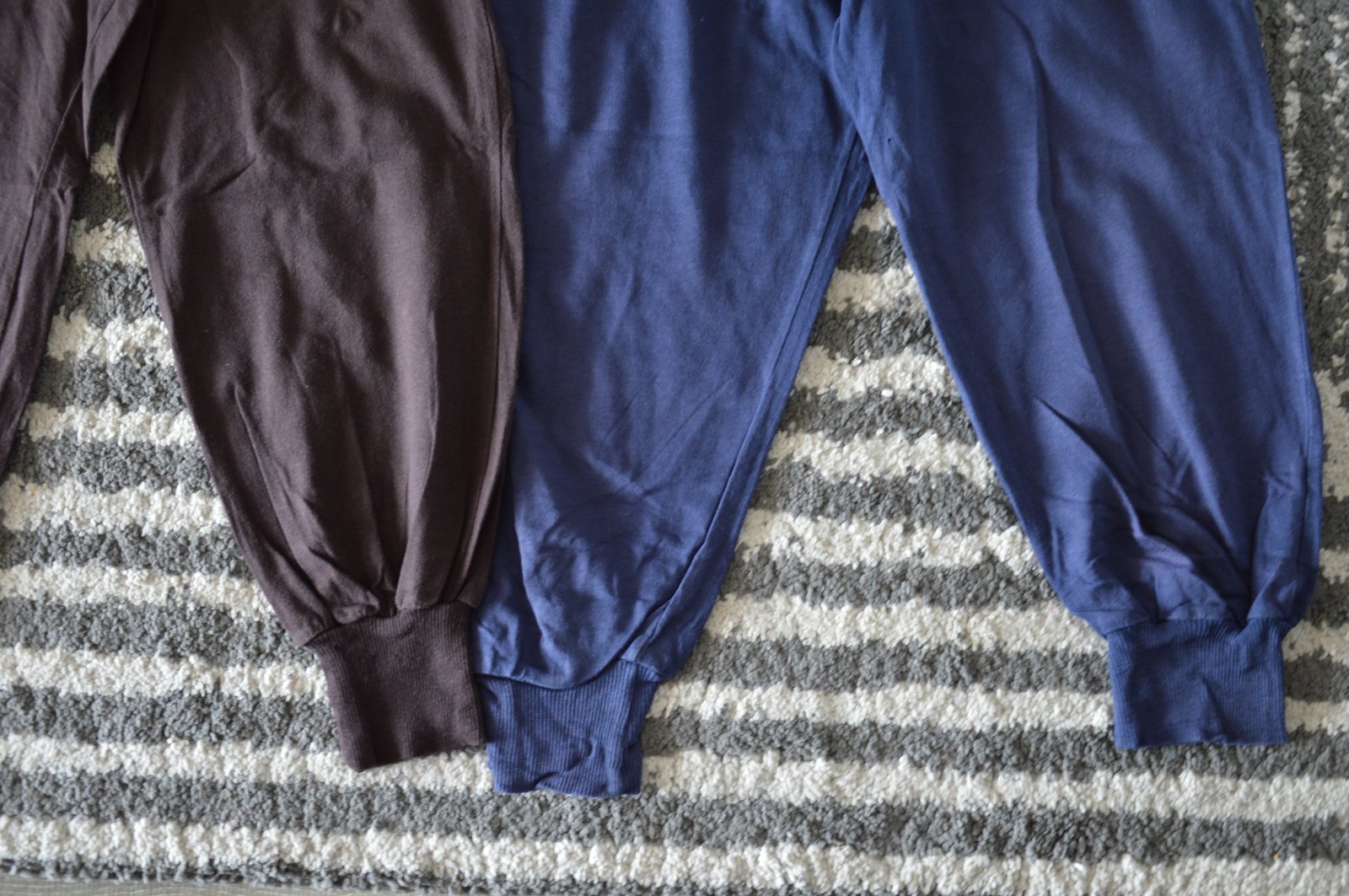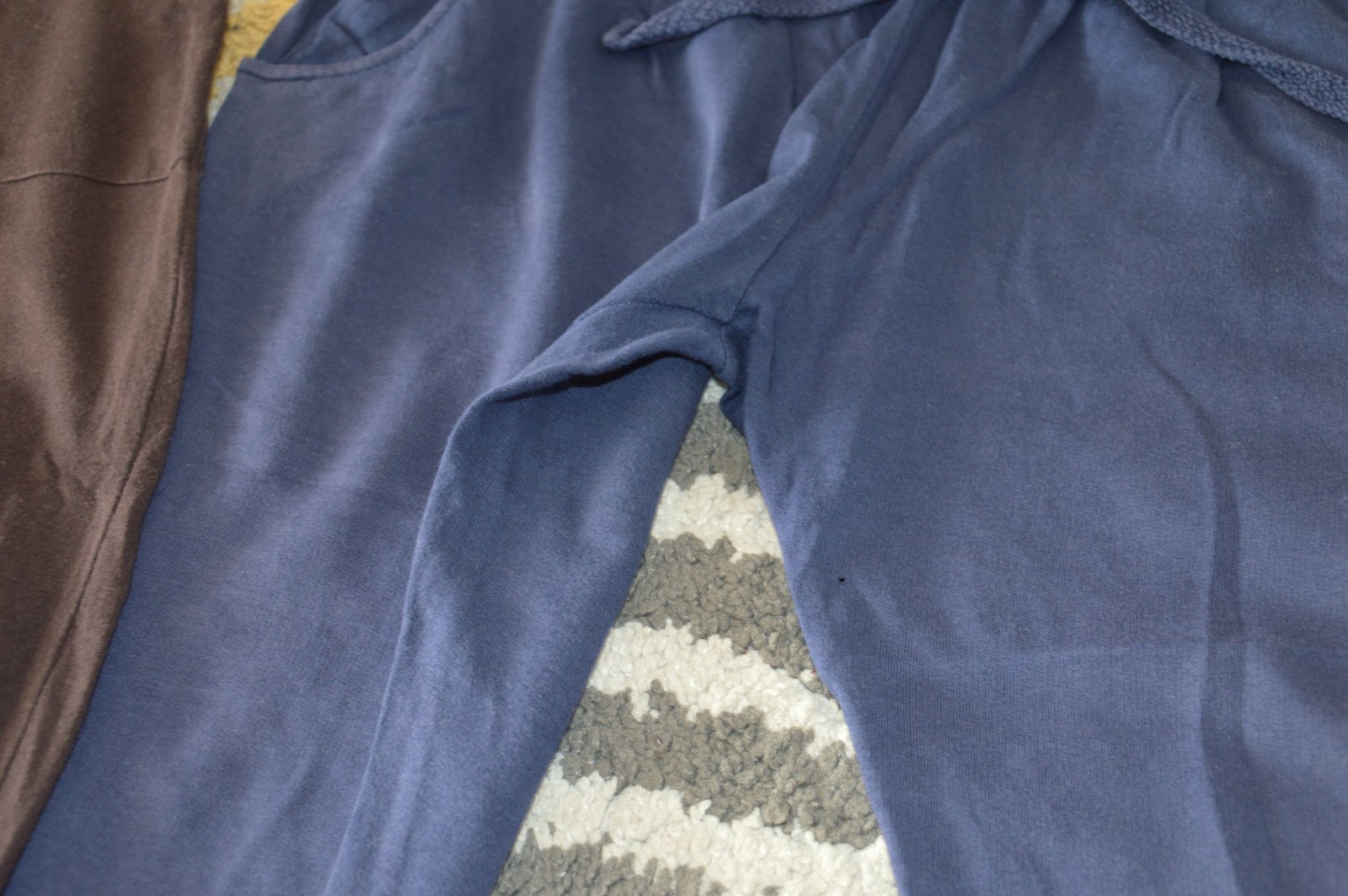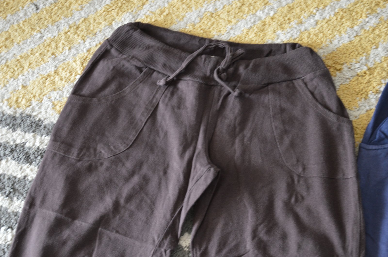 Pekný stav, bavlnené, bledšia farba, pekne ukážu, bez žmolkov, držia tvar, funkčné šnúrky v páse, na modrých jedna dierka pri rozkroku, hnedé Fishbone, modré Bershka,