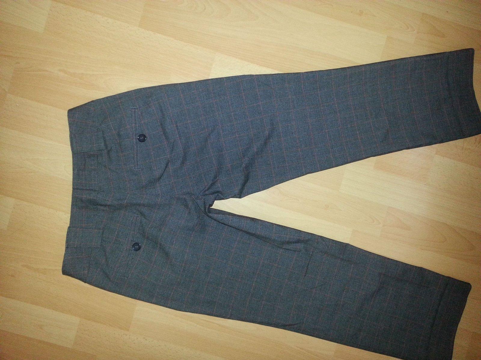 Pekné jemne kárované 3/4 nohavice. Dĺžka 78 cm, spodný lem sa dá vyhrnúť. Pás 2 x 37 cm. Materiál 62% polyester, 35% viskóza, 3% elastan. Výborný stav.