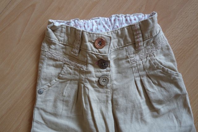 Príjemné 3/4 nohavice. Zapínanie na gombíky, v páse regul. guma. Dole do gumičky, vrecká. 100% stav.