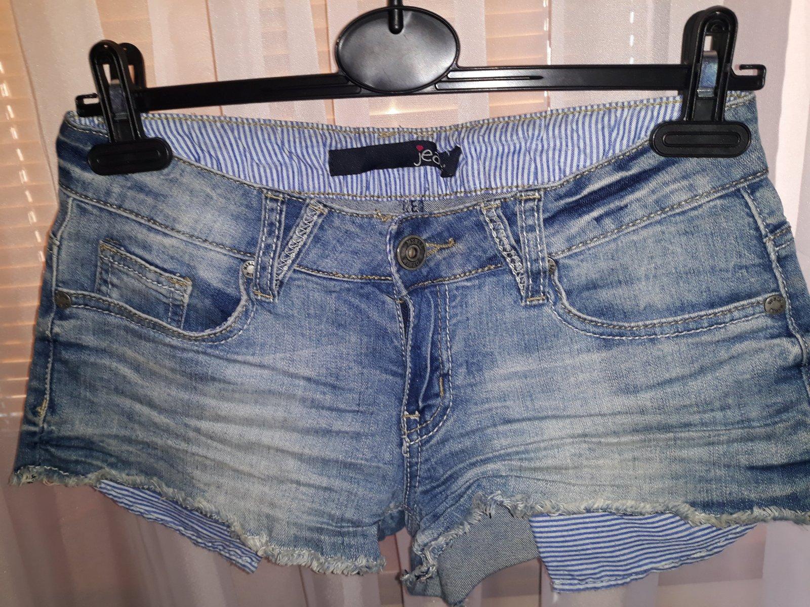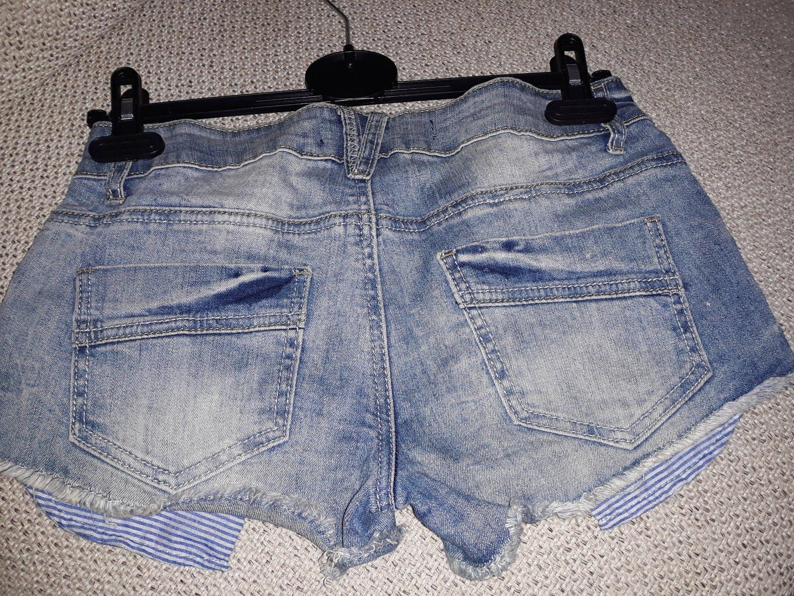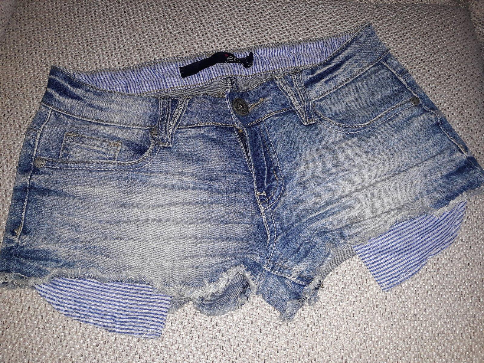 Moderné rifľové kraťasy v obnosenom vzhľade vo veľmi dobrom stave. Veľkosť 34 (XS - S). Rozmery: obvod pása- 83 cm, obvod nohavice - 58 cm (v nenatiahnutom stave), dĺžka kraťasov - 21 cm (predný diel), 28 cm (zadný diel). Kraťasy sú elastické, materiál: 98 % bavlna 2 % elastan.