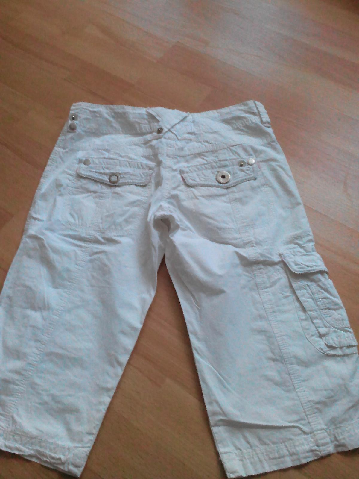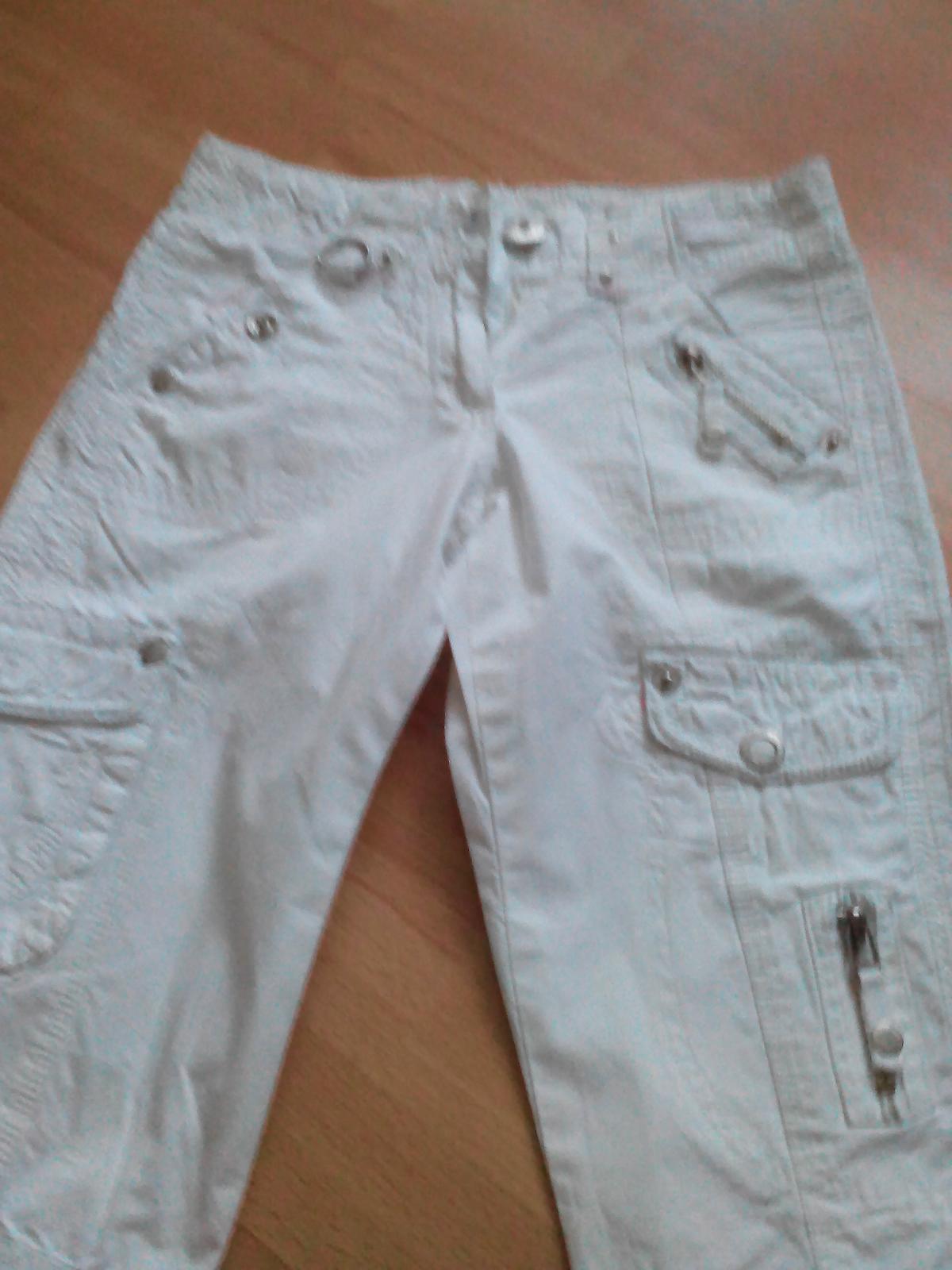 Pekné 3/4-ťove nohavice ,zn H&M...veľ.158. V predu 2 vrecká ,vzadu 2 vrecká a na jednom boku vrecko. Výborný stav.