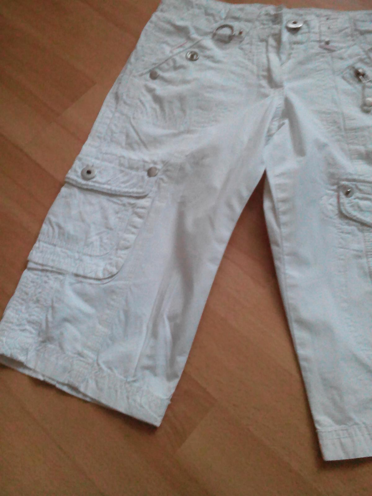 Biele kapri málo nosené, nepoškodené v peknom stave. ZN. H&M Materiál 98% Bavlna, 2% Elastan Šírka pásu 35,5 x2cm Šírka bokov 41 x2cm Dĺžka zadného sedu. 26 cm Dĺžka predného sedu 20 cm Dĺžka bočn...