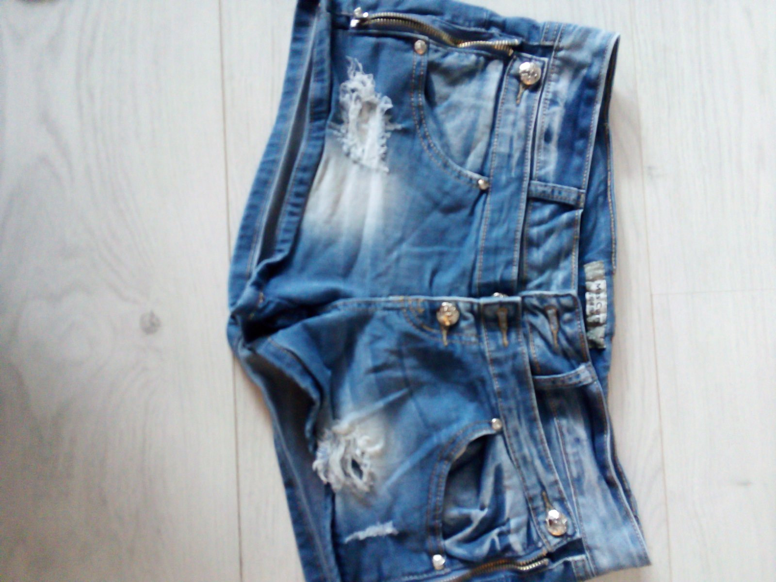 Limetkové riflové kraťasy, majú ozdobné roztrhnuté diery, pevné, nie sú elastické. Šírka v páse 33cm, boky 44cm