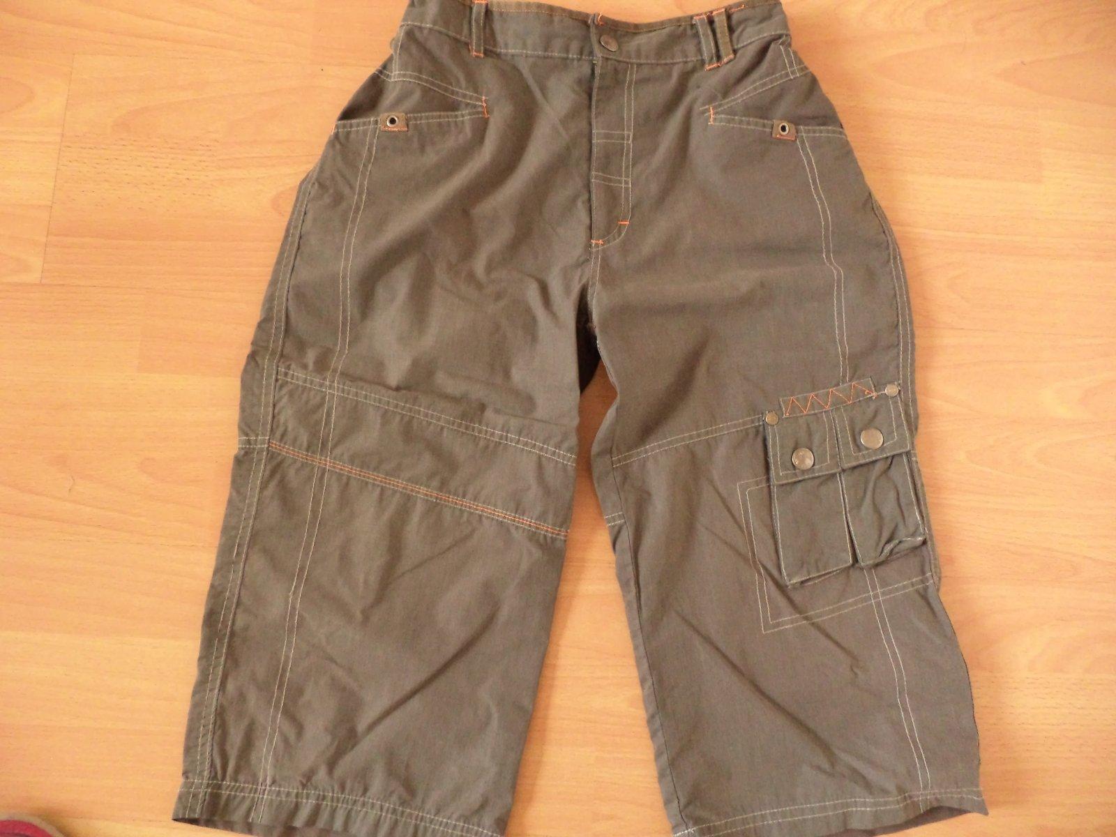 Nosene chlapčenske trojštvrťove nohavice olivovej farby malinko sprate ale možno niekomu ešte poslužia. V pase vzadu je gumička ,celkova dlžka 68cm, dlžka od rozkroku 42cm, boky 52cm, pas 64