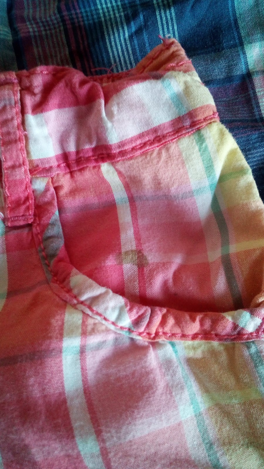 V zachovalom nosenom stave, na svetlejsich jedna škvrna viď foto tam kde je vrecko. Tmavé bez škvŕn a poškodení. Cena za jedny kraťasy bez poštovného.