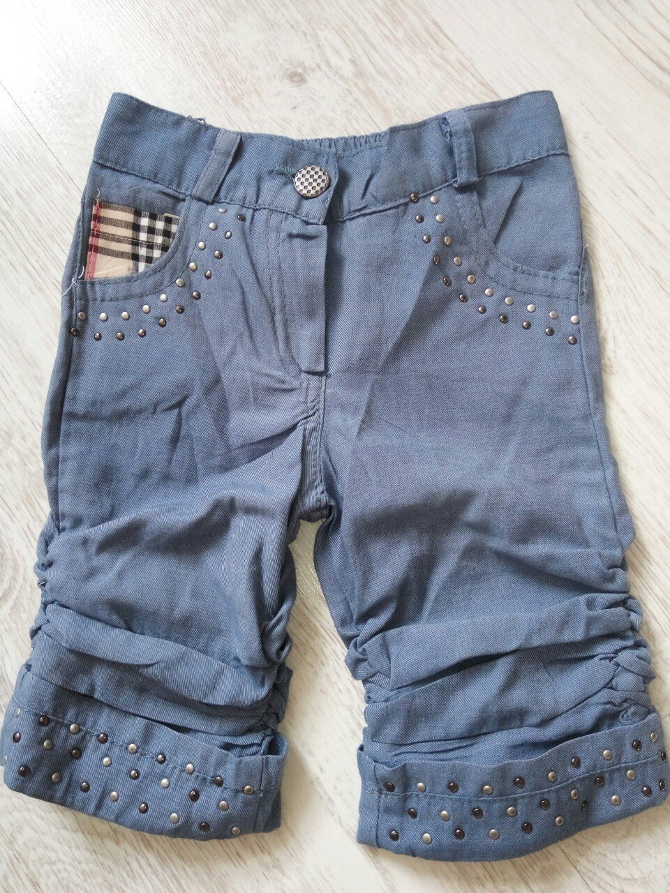 Tenučké nohavicové kraťase na bokoch pri kolenách s riasením. Top stav