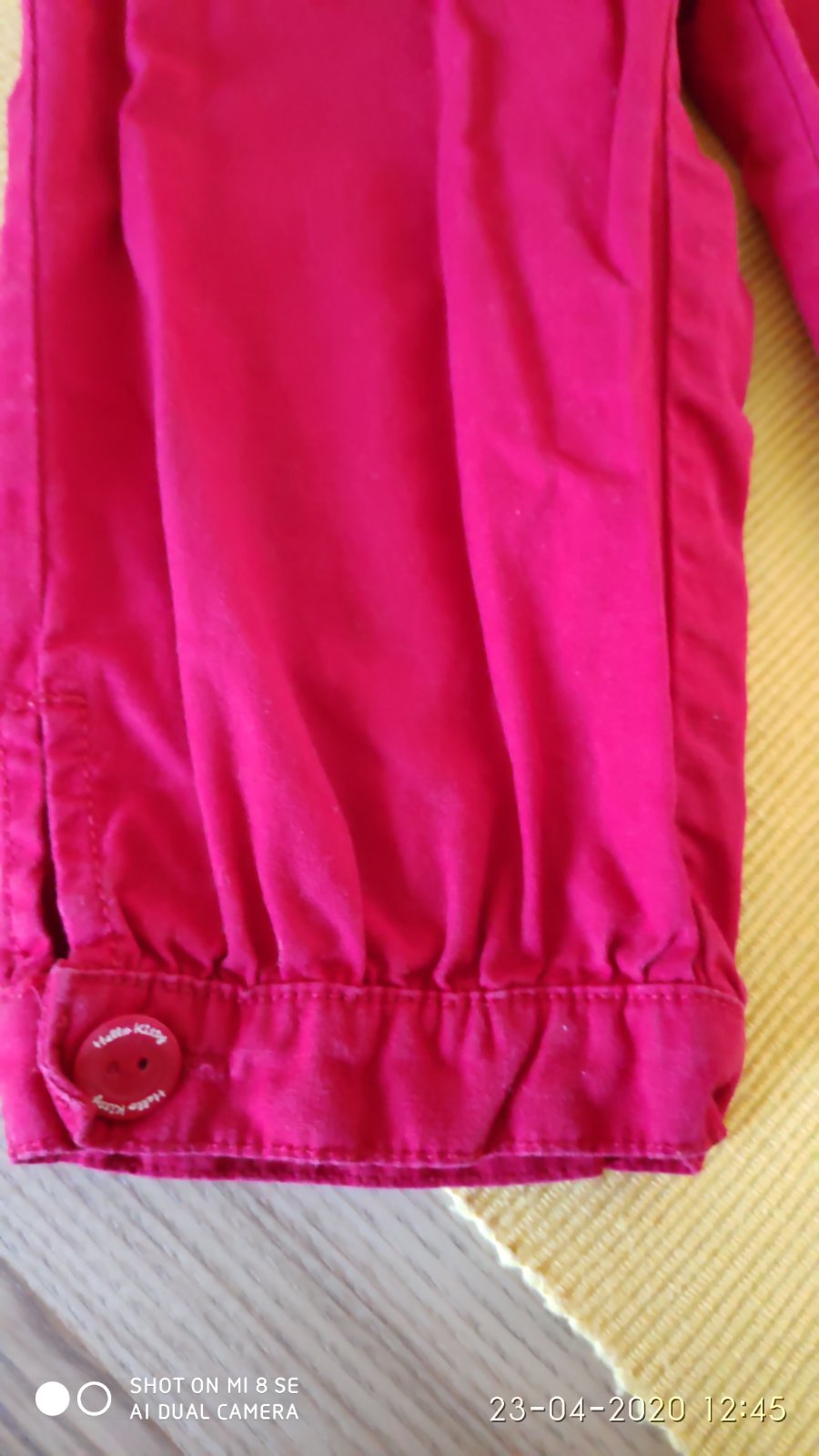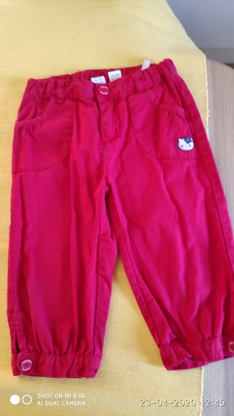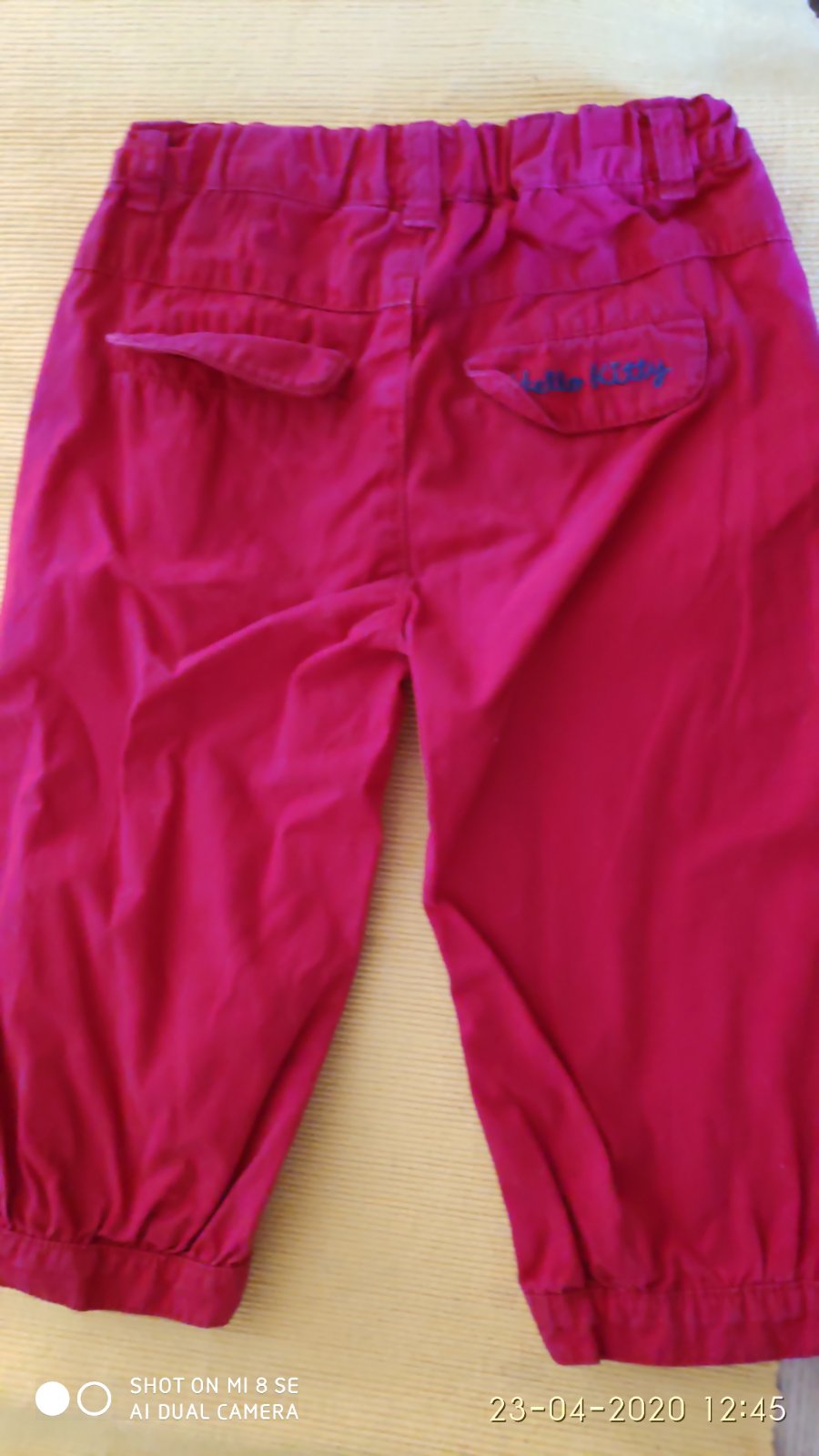 Nohavice príjemný materiál, veľkosť 3-4 roky, sú 3/4tove a dole je gombík, v páse sa dajú regulovať gumou, výšivka hello Kitty, vpredu a vzadu funkčné vrecká, dĺžka 43cm, šírka v bokoch 33cm, osobný odber Prešov alebo pošlem poštou 😉