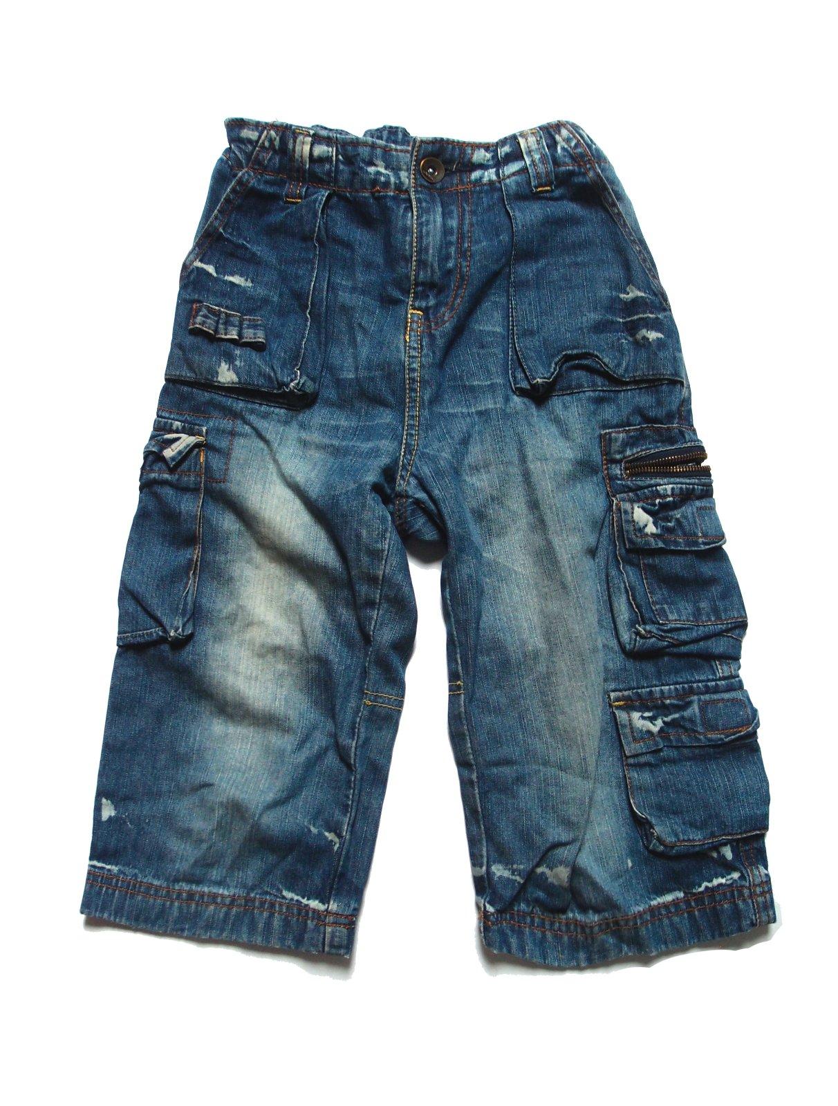 v páse nastaviteľná guma, vrecká a kapsy aj na zips, ošúchaný vzhľad, veľmi dobrý stav, uv. veľ. 7-8 rokov, veľ. 128