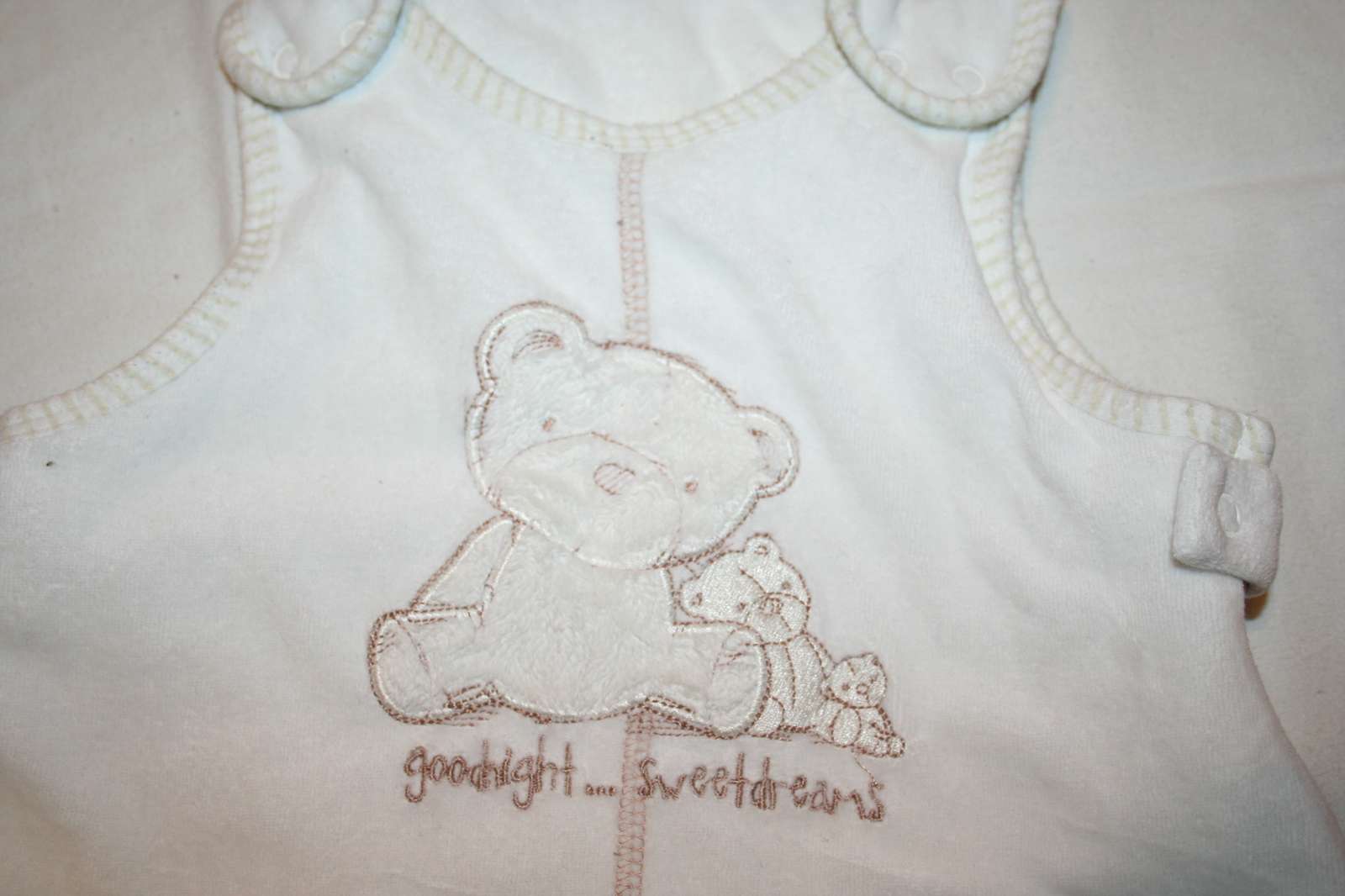Nosený spací vak, v bez poškodení, žiadne diery, fľaky...., vonkajšia látka je velúr, vo vnútri pošitý bavlnenou látkou, teplučký vhodný na zimu, veľkosť písaná 0-6 mesiacov,