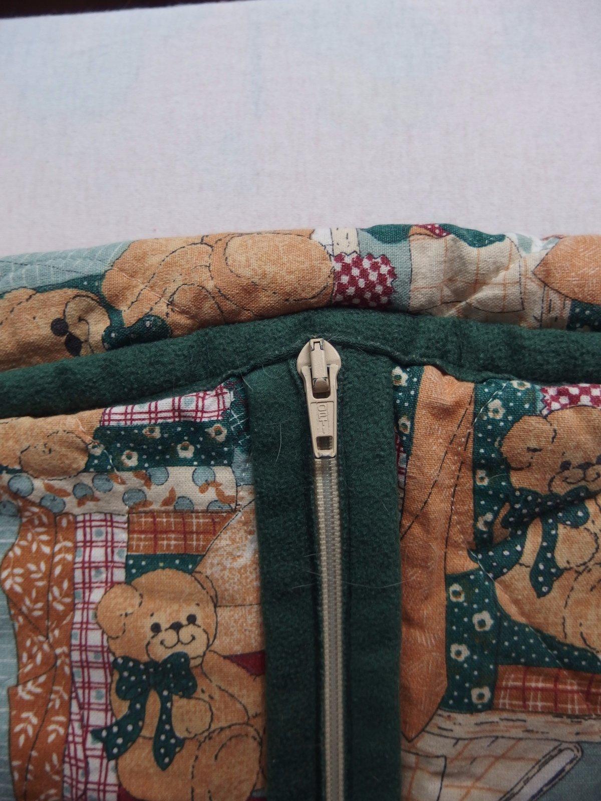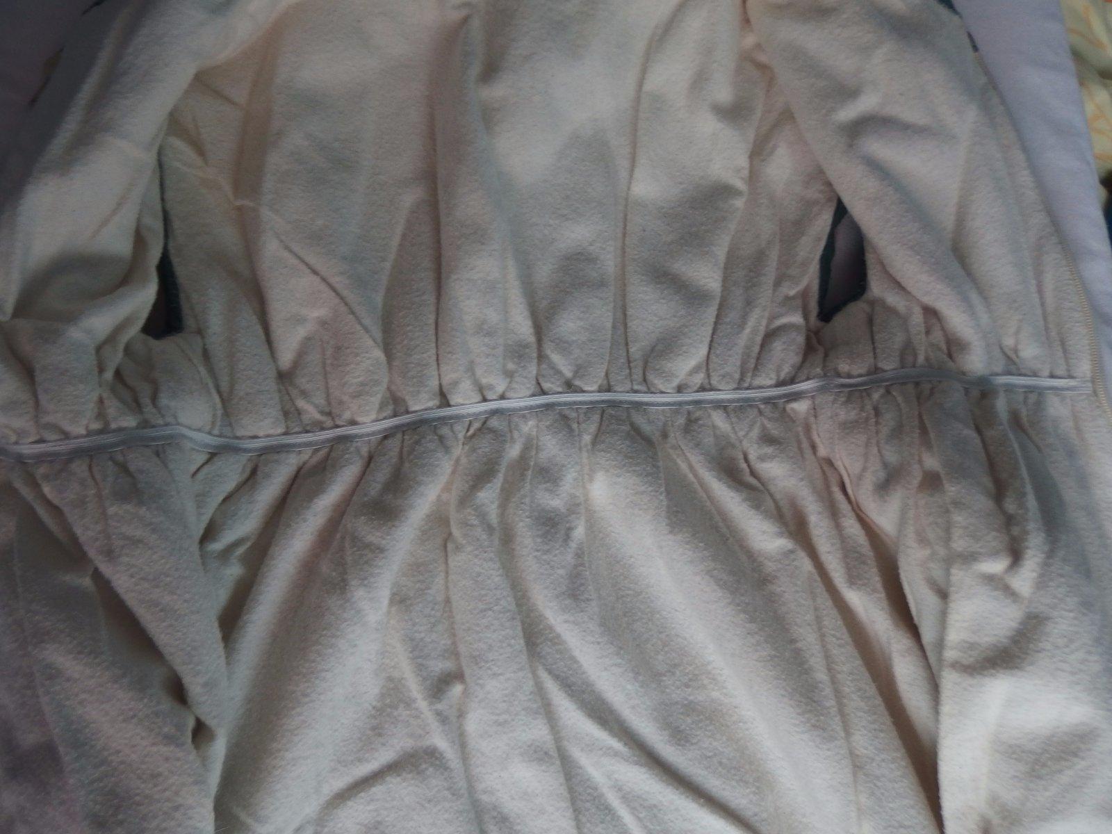 Bez rukávov, zapína sa od krku nadol, okolo pása je gumička, naozaj je teplý.